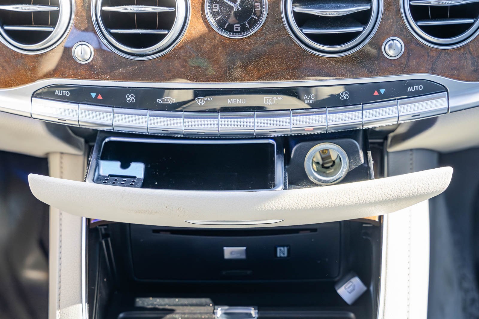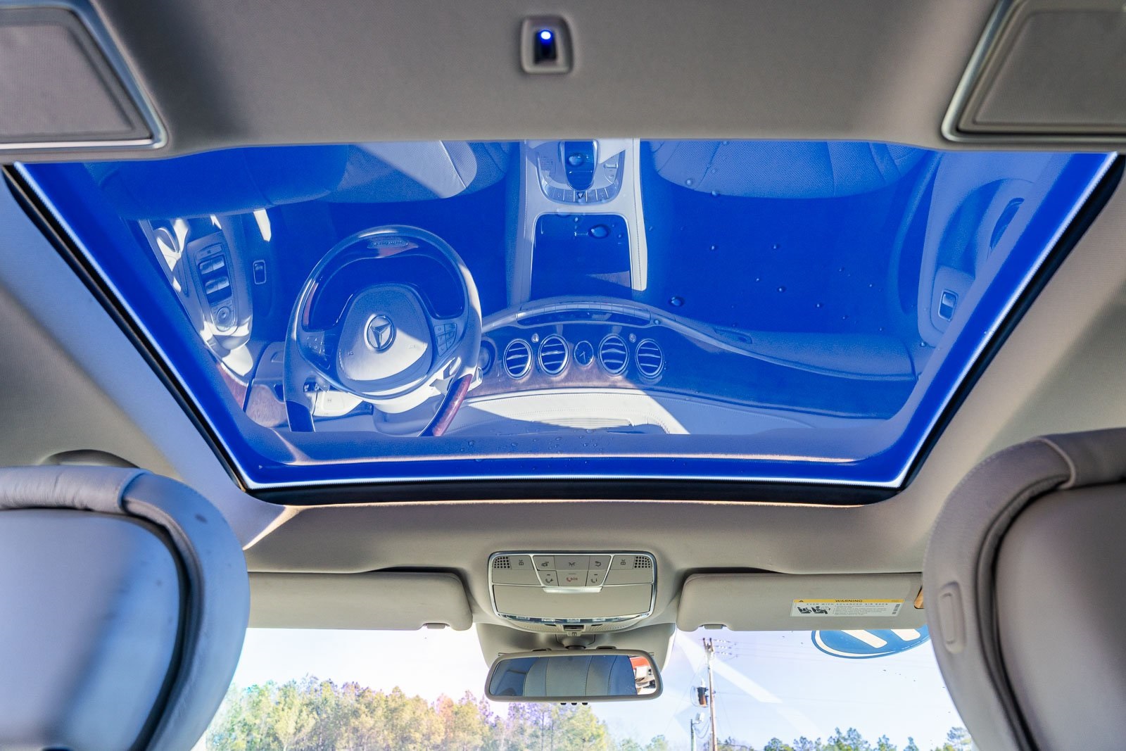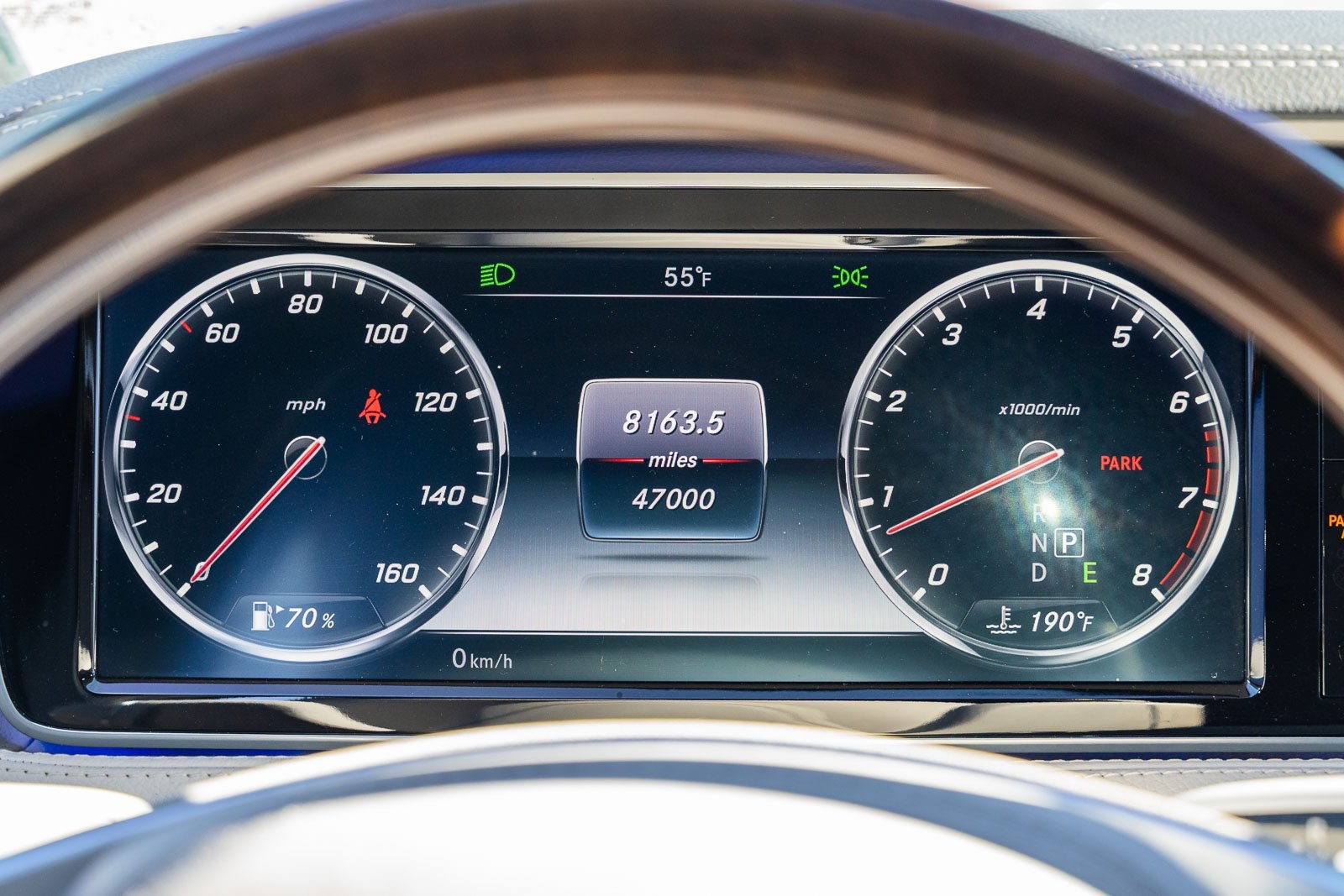 This vehicle comes equipped with Crystal Gray/Seashell Gray w/Leather Upholstery, 13 Speakers, 18" 5-Spoke Wheels, 4-Wheel Disc Brakes, ABS brakes, Adaptive suspension, Air Conditioning, Alloy wheels, AM/FM radio: SiriusXM, Anti-whiplash front head restraints, Auto High-beam Headlights, Auto tilt-away steering wheel, Auto-dimming door mirrors, Auto-dimming Rear-View mirror, Auto-leveling suspension, Automatic temperature control, Brake assist, Bumpers: body-color, Burl Walnut Wood Trim, CD player, Child-Seat-Sensing Airbag, Compass, Delay-off headlights, Door auto-latch, Driver door bin, Driver vanity mirror, Dual front impact airbags, Dual front side impact airbags, DVD-Audio, Electronic Stability Control, Emergency communication system: mbrace2, Exterior Parking Camera Rear, Four wheel independent suspension, Front anti-roll bar, Front Bucket Seats, Front Center Armrest, Front dual zone A/C, Front reading lights, Garage door transmitter: Homelink, Genuine wood console insert, Genuine wood door panel insert, Head restraints memory, Heated door mirrors, Heated front seats, Heated Power Front Seats w/Memory, HVAC memory, Illuminated entry, Knee airbag, Leather steering wheel, Leather Upholstery, Low tire pressure warning, Memory seat, Navigation system: COMAND®, Occupant sensing airbag, Outside temperature display, Overhead airbag, Overhead console, Panic alarm, Passenger door bin, Passenger vanity mirror, Power adjustable front head restraints, Power adjustable rear head restraints, Power door mirrors, Power driver seat, Power moonroof: Panorama, Power passenger seat, Power steering, Power windows, Premium audio system: COMAND®, Radio data system, Rain sensing wipers, Rear anti-roll bar, Rear fog lights, Rear reading lights, Rear seat center armrest, Rear side impact airbag, Rear Window Blind, Rear window defroster, Remote keyless entry, Security system, Speed control, Speed-sensing steering, Steering wheel memory, Steering wheel mounted audio controls, Tachometer, Telescoping steering wheel, Tilt steering wheel, Traction control, Trip computer, Turn signal indicator mirrors, Variably intermittent wipers, and Weather band radio.
