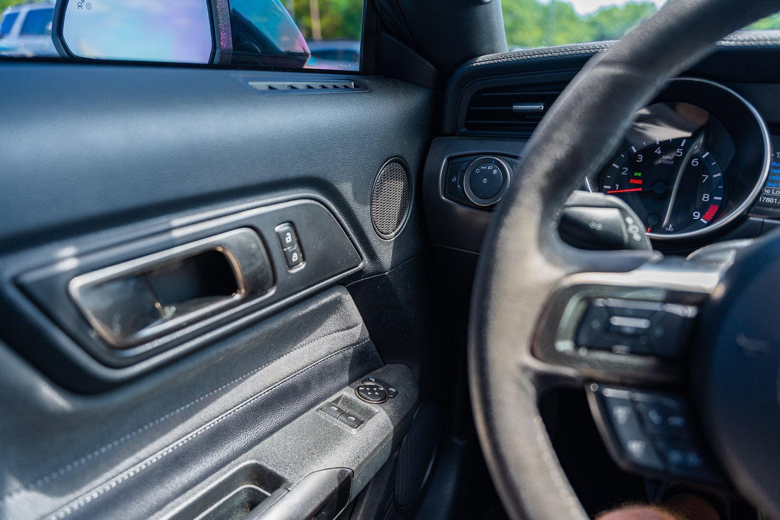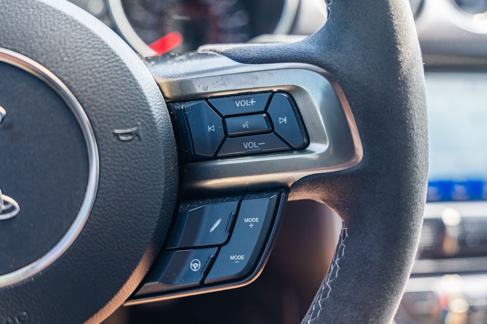 This vehicle comes equipped with GT350 Equipment Group 900A, Technology Package (BLIS Blind Spot Information System, Heated Mirrors, Radio: B&O Sound System by Bang & Olufsen, and Voice-Activated Touch-Screen Navigation System), Mustang Shelby GT350, Ford Gold Certified Certified, 5.2L Ti-VCT V8, Tremec 6-Speed Manual, 4-Wheel Disc Brakes, 9 Speakers, ABS brakes, Adaptive suspension, Air Conditioning, Alloy wheels, AM/FM radio: SiriusXM, AM/FM Stereo, AppLink/Apple CarPlay and Android Auto, Auto-dimming Rear-View mirror, Automatic temperature control, Brake assist, Bumpers: body-color, CD player, Compass, Delay-off headlights, Driver door bin, Driver vanity mirror, Dual front impact airbags, Dual front side impact airbags, Electronic Stability Control, Emergency communication system: 911 Assist, Exterior Parking Camera Rear, Four wheel independent suspension, Front anti-roll bar, Front Bucket Seats, Front Center Armrest, Front dual zone A/C, Front reading lights, Fully automatic headlights, Garage door transmitter, High-Intensity Discharge Headlights, Illuminated entry, Knee airbag, Low tire pressure warning, Navigation System, Occupant sensing airbag, Outside temperature display, Overhead airbag, Overhead console, Panic alarm, Passenger door bin, Passenger vanity mirror, Power door mirrors, Power steering, Power windows, Radio data system, Rear anti-roll bar, Rear window defroster, RECARO Cloth/Miko Suede Sport Seats, Remote keyless entry, Security system, SiriusXM Radio, Speed control, Speed-sensing steering, Speed-Sensitive Wipers, Split folding rear seat, Spoiler, Sport steering wheel, Steering wheel mounted audio controls, SYNC 3 Communications & Entertainment System, Tachometer, Telescoping steering wheel, Tilt steering wheel, Traction control, Trip computer, Variably intermittent wipers, Voltmeter, and Wheels: 19" x 10.5" Fr/19" x 11" Rr Ebony Black.