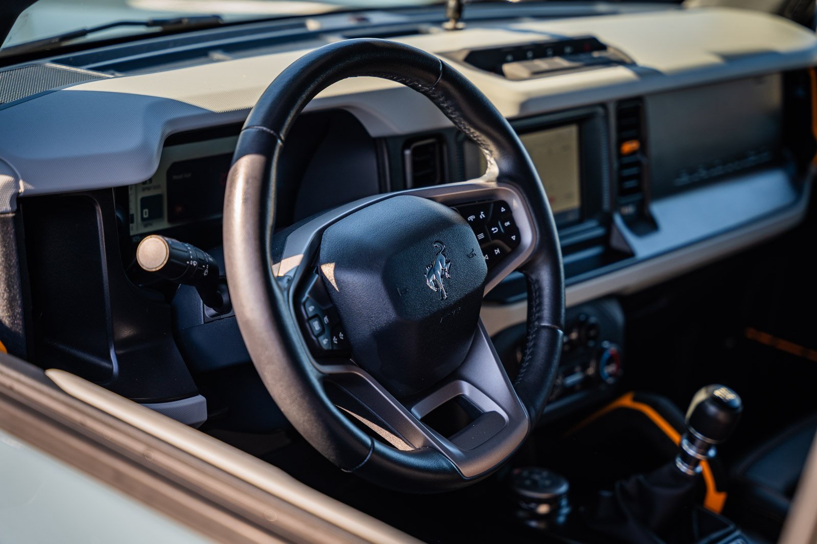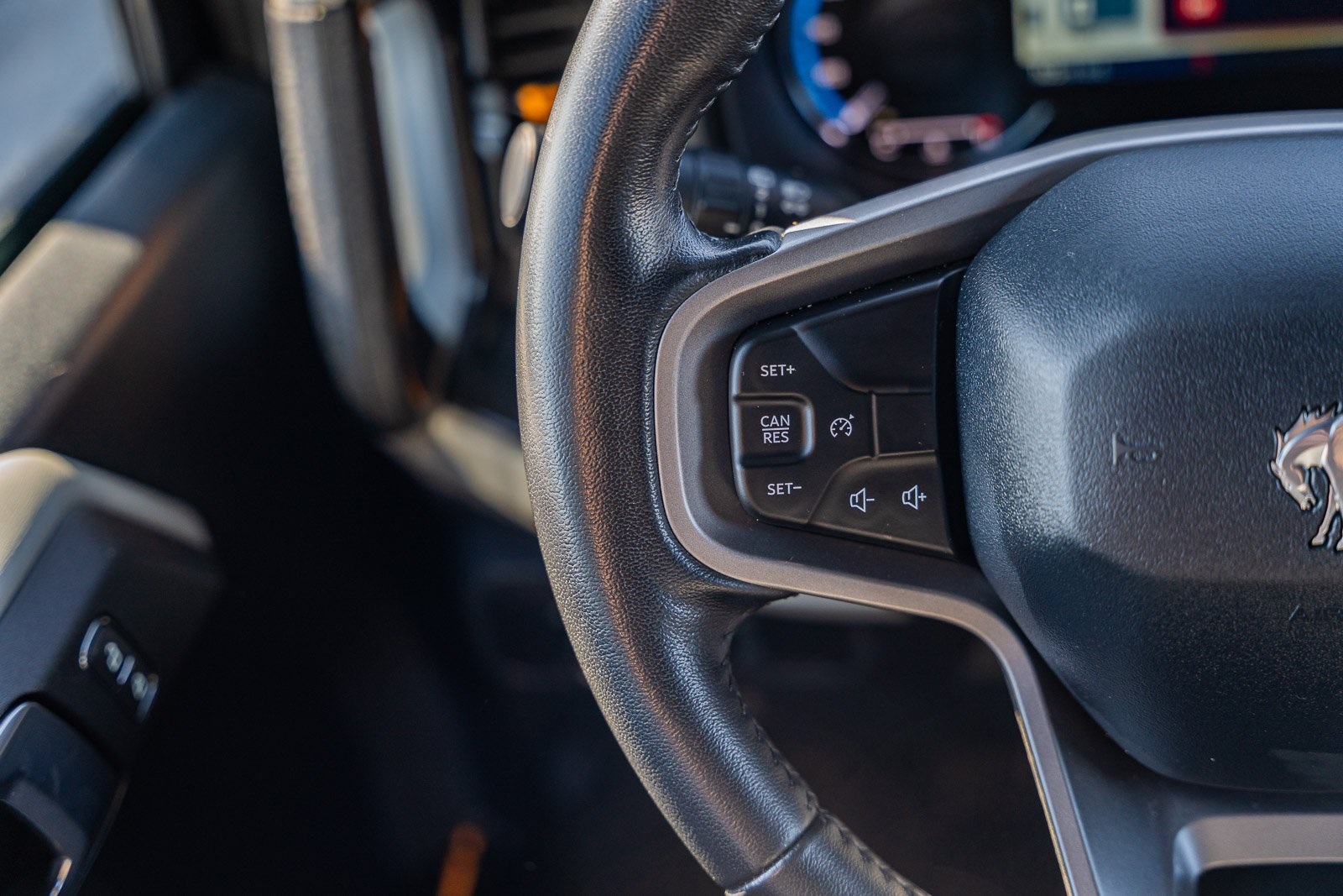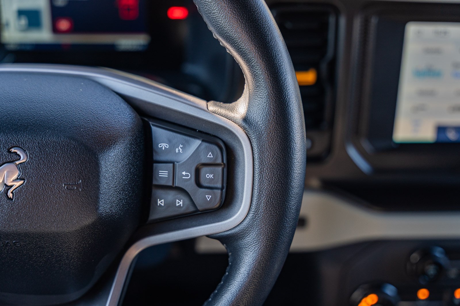 This vehicle comes equipped with Equipment Group 331A Standard Package, Ford Certified, 4-Wheel Disc Brakes, 4.7 Axle Ratio, 6 Speakers, ABS brakes, Air Conditioning, Alloy wheels, AM/FM radio: SiriusXM with 360L, AM/FM Stereo, Auto High-beam Headlights, Brake assist, Compass, Delay-off headlights, Driver door bin, Driver vanity mirror, Dual front impact airbags, Dual front side impact airbags, Electronic Stability Control, Emergency communication system: 911 Assist, Exterior Parking Camera Rear, Ford Performance Heavy-Duty Modular Front Bumper, Front anti-roll bar, Front Bucket Seats, Front Center Armrest, Front reading lights, Front wheel independent suspension, Fully automatic headlights, Heated door mirrors, Illuminated entry, Integrated roll-over protection, Leather Shift Knob, Low tire pressure warning, Marine Grade Vinyl Bucket Seats, Occupant sensing airbag, Outside temperature display, Overhead airbag, Overhead console, Panic alarm, Passenger door bin, Passenger vanity mirror, Power door mirrors, Power steering, Power windows, Radio data system, Remote keyless entry, Security system, SiriusXM Radio w/360L, Speed control, Split folding rear seat, Steering wheel mounted audio controls, SYNC 4, Tachometer, Telescoping steering wheel, Tilt steering wheel, Traction control, Trip computer, Variably intermittent wipers, Voltmeter, and Wheels: 17" Machined Carbonized Aluminum.