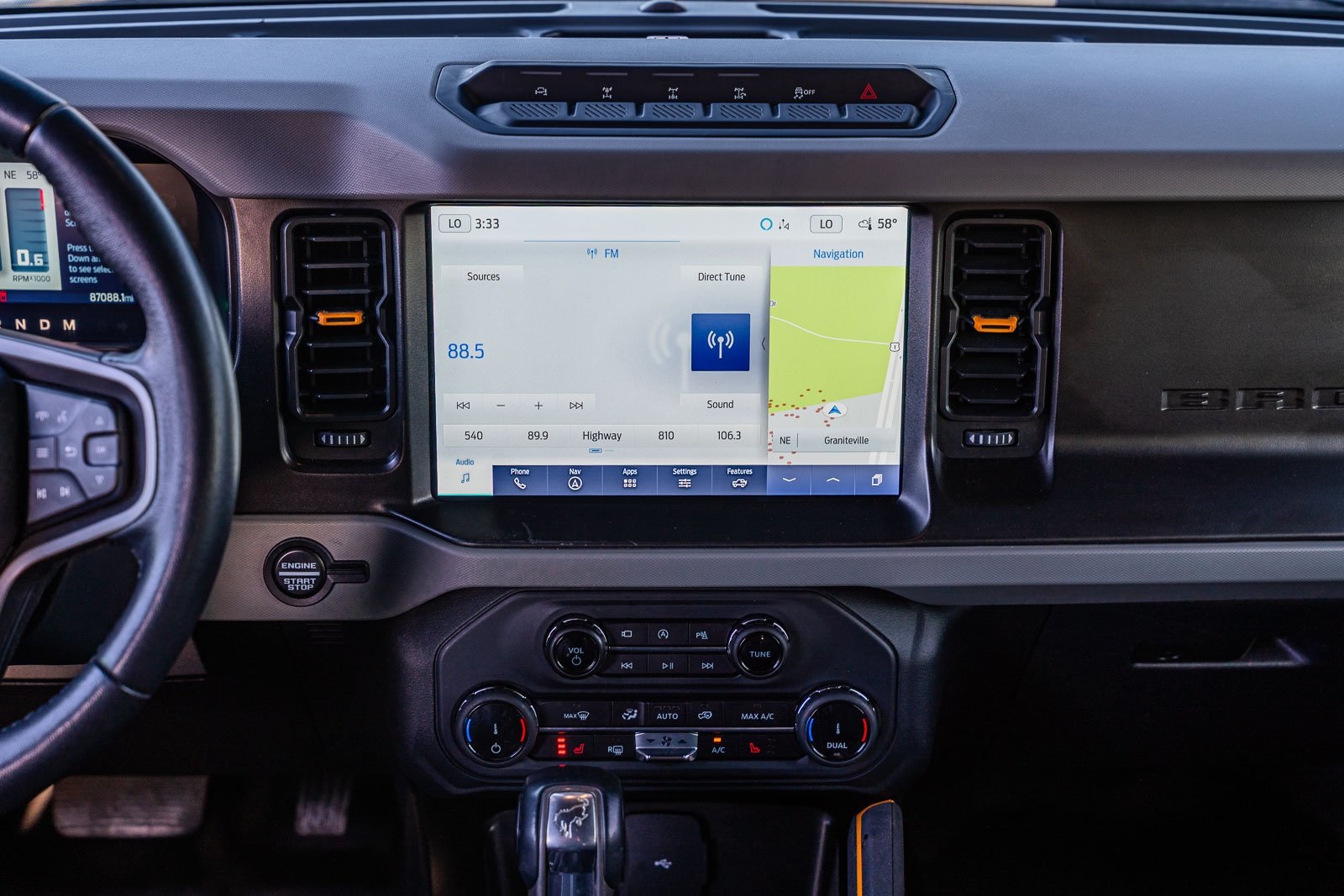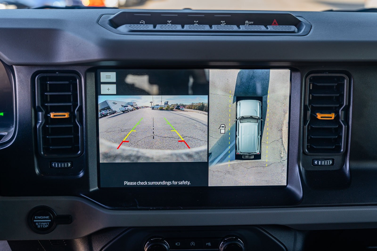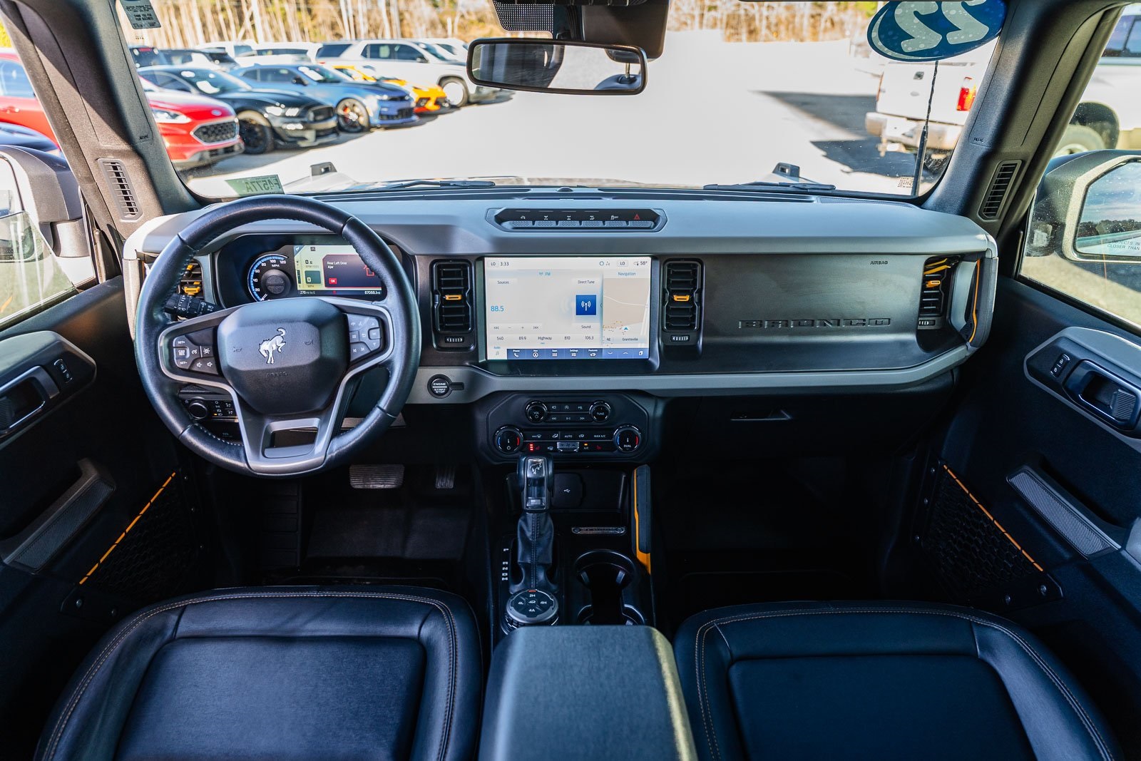 This vehicle comes equipped with Ford Certified, 4-Wheel Disc Brakes, 6 Speakers, ABS brakes, Air Conditioning, AM/FM radio: SiriusXM with 360L, AM/FM Stereo, Auto High-beam Headlights, Brake assist, Carbonized Gray Molded-In-Color Hard Top, Compass, Delay-off headlights, Driver door bin, Driver vanity mirror, Dual front impact airbags, Dual front side impact airbags, Electronic Stability Control, Emergency communication system: 911 Assist, Exterior Parking Camera Rear, Ford Performance Heavy-Duty Modular Front Bumper, Front & Rear Floor Liners, Front anti-roll bar, Front Bucket Seats, Front Center Armrest, Front License Plate Bracket, Front reading lights, Front Row Top Panels Storage Bag, Front wheel independent suspension, Fully automatic headlights, Heated door mirrors, Illuminated entry, Integrated roll-over protection, Keyless Entry Keypad, Low tire pressure warning, Occupant sensing airbag, Outside temperature display, Overhead airbag, Overhead console, Panic alarm, Passenger door bin, Passenger vanity mirror, Power door mirrors, Power steering, Power windows, Radio data system, Rear-Window Defroster & Washer, Remote keyless entry, Security system, SiriusXM Radio w/360L, Speed control, Split folding rear seat, Steering wheel mounted audio controls, SYNC 4, Tachometer, Telescoping steering wheel, Tilt steering wheel, Traction control, Trip computer, Variably intermittent wipers, and Wheels: 17" Black High Gloss-Painted Aluminum.