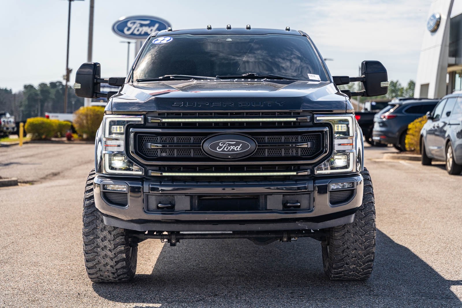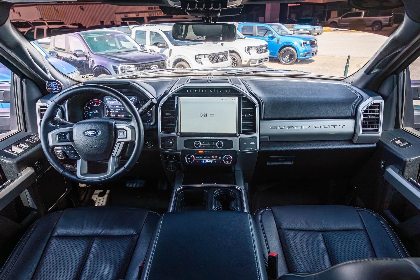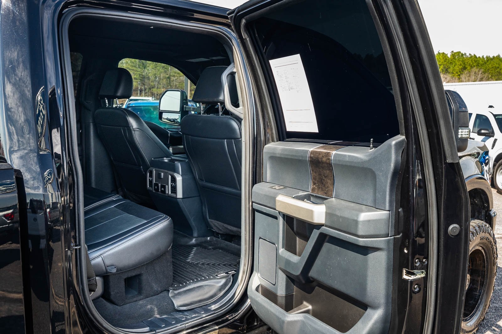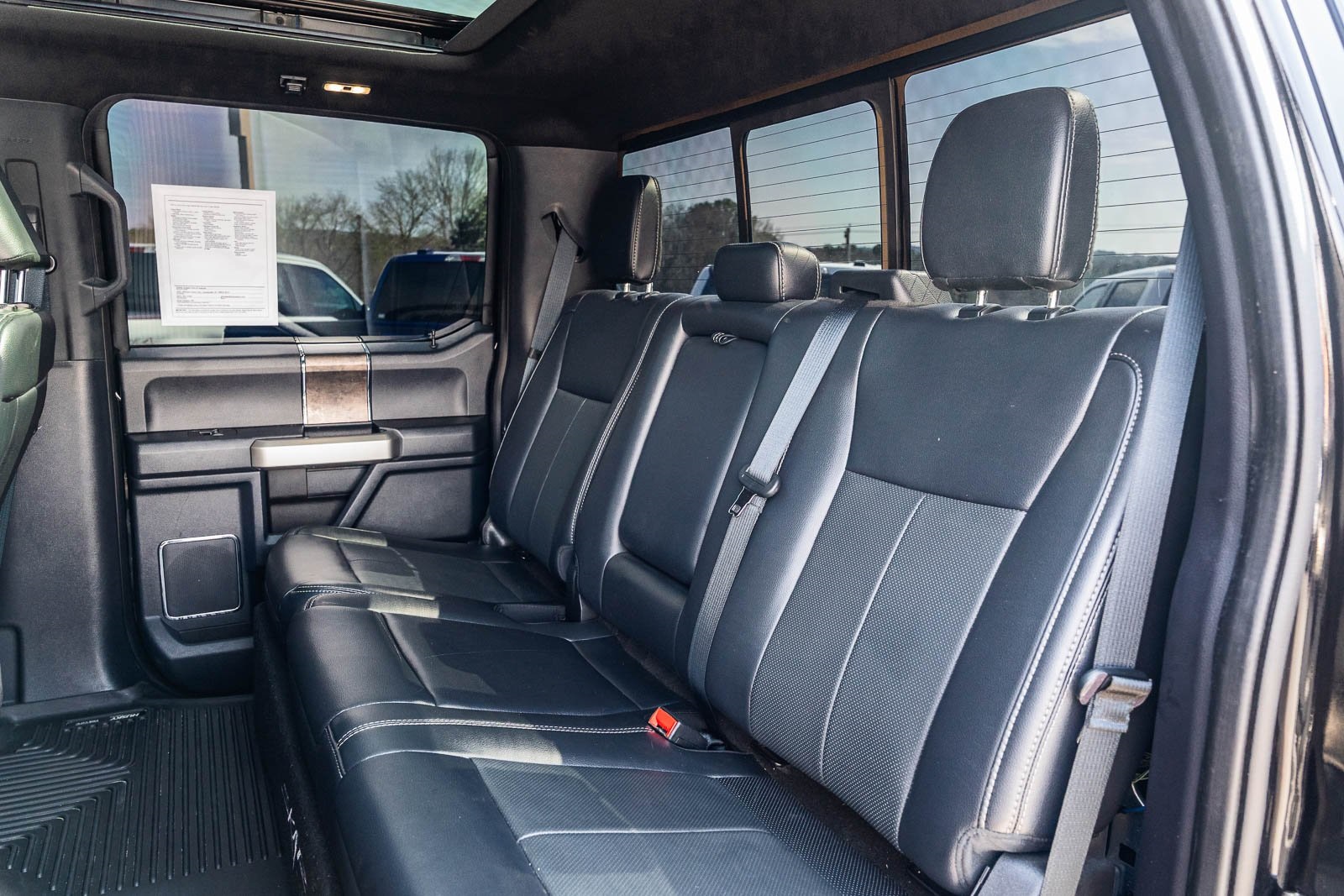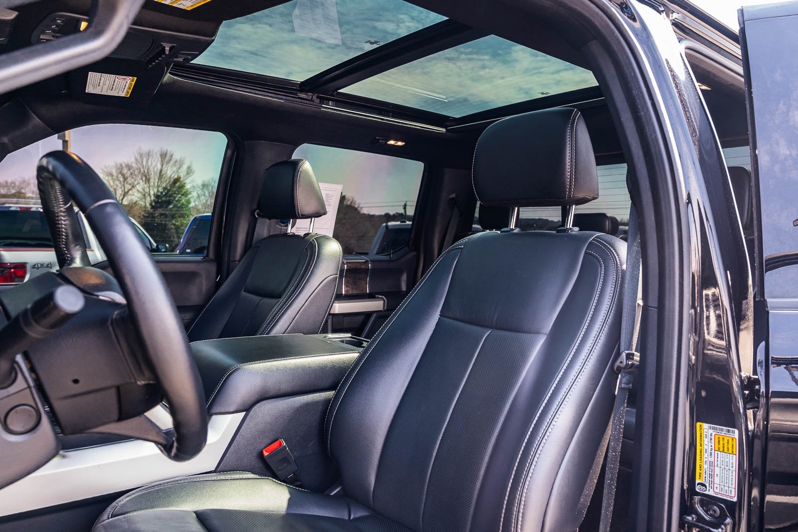 This vehicle comes equipped with GVWR: 10,000 lb Payload Package, High Capacity Trailer Tow Package, Lariat Black Appearance Pkg w/o Spray-In Bedliner (6" Ebony Black Angular Running Boards, Black Out Surrounds LED Only Headlamps, Body-Color Front & Rear Bumpers, Ebony Black Painted Front Grille Bars, Ebony Black Painted Mirror Caps, Rear Wheel Well Liners (Pre-Installed), and Wheels: 20" High-Gloss Black Premium Painted Alum), Lariat Ultimate Package (Ambient Lighting - Fixed Color, Easy Entry®/Exit Memory Driver's Seat Feature, Intelligent Access w/Push-Button Start, LED Box Lighting, Memory Power-Adjustable Pedals, Power Heated/Ventilated Driver Seat w/Memory, Power Heated/Ventilated Passenger Seat, Power Telescoping/Tilt Steering Wheel/Column, PowerScope Trailer Tow Mirrors w/Memory, Remote Start System, Remote Tailgate Release, and Tailgate Step & Handle), Order Code 608A, Pro Trailer Backup Assist - High Capacity (Lane Departure Warning System and Ultimate Trailer Tow Camera System), 4WD, 10 Speakers, 397 Amp Alternator, 4-Wheel Disc Brakes, ABS brakes, Adjustable pedals, Advanced Security Pack Inclination Sensor Removal, Air Conditioning, Alloy wheels, AM/FM radio: SiriusXM with 360L, Auto High-beam Headlights, Auto-dimming Rear-View mirror, Automatic temperature control, Brake assist, Bumpers: chrome, Compass, Delay-off headlights, Driver door bin, Driver vanity mirror, Dual front impact airbags, Dual front side impact airbags, Electronic Stability Control, Emergency communication system: SYNC 4 911 Assist, Engine Block Heater, Exterior Parking Camera Rear, Flow-Through Console, Front anti-roll bar, Front Bucket Seats, Front Center Armrest, Front dual zone A/C, Front fog lights, Front Leather Seating Surfaces 40/Console/40, Front reading lights, Fully automatic headlights, Heated door mirrors, Heated Steering Wheel, Illuminated entry, Leather steering wheel, LED Roof Clearance Lights, Low tire pressure warning, Navigation system: Connected Navigation, Outside temperature display, Overhead airbag, Overhead console, Panic alarm, Passenger door bin, Passenger vanity mirror, Power door mirrors, Power driver seat, Power passenger seat, Power steering, Power windows, Power-Deployable Running Boards, PowerScope Trailer Tow Mirrors w/Heat, Radio data system, Radio: B&O Sound System by Bang & Olufsen, Rain-Sensing Windshield Wipers, Rapid-Heat Supplemental Cab Heater, Rear Parking Sensors, Rear reading lights, Rear seat center armrest, Rear step bumper, Rear window defroster, Remote keyless entry, Security system, SiriusXM Radio w/360L, Speed control, Split folding rear seat, Steering wheel mounted audio controls, SYNC 4 w/Enhanced Voice Recognition, Tachometer, Telescoping steering wheel, Tilt steering wheel, Traction control, Trip computer, Turn signal indicator mirrors, Twin Panel Power Moonroof, Upfitter Switches (6), Variably intermittent wipers, and Wheels: 18" Bright Machined Cast Aluminum.