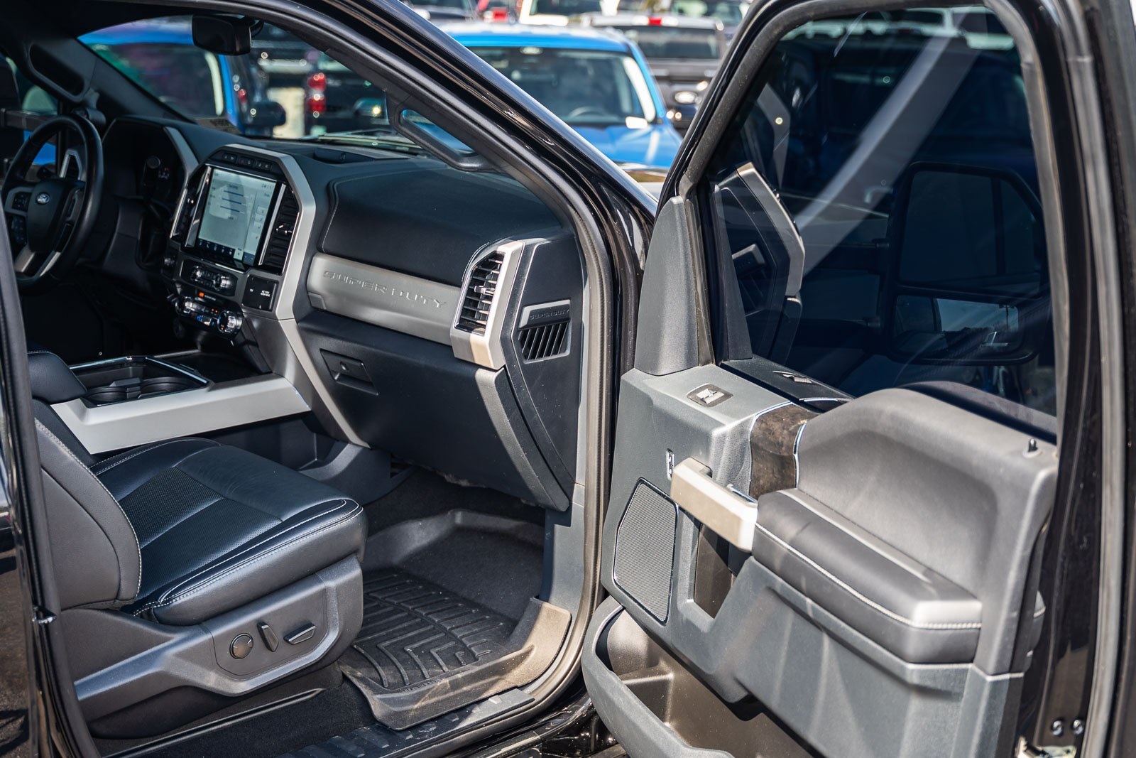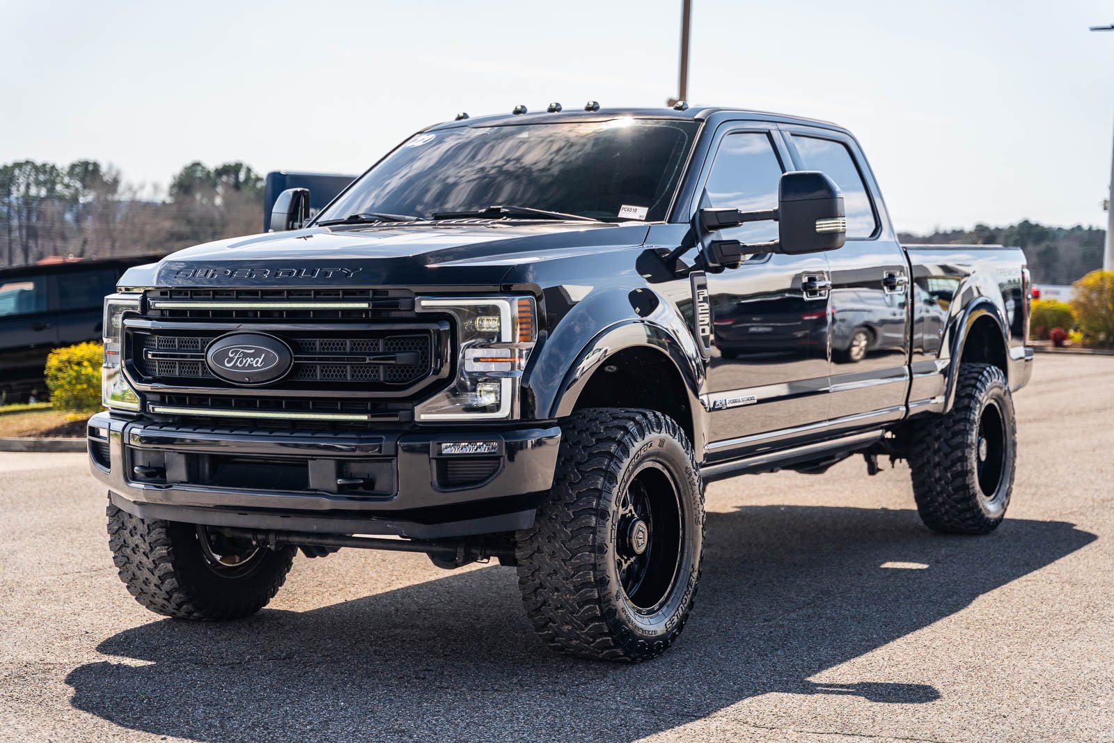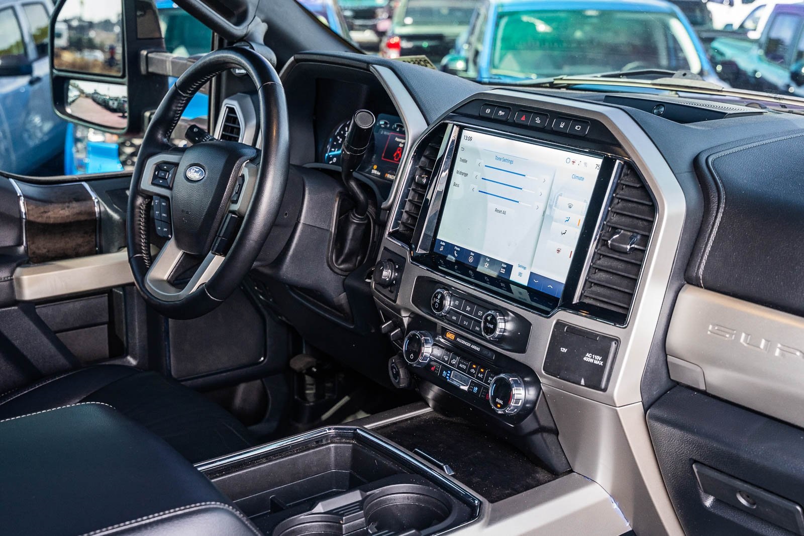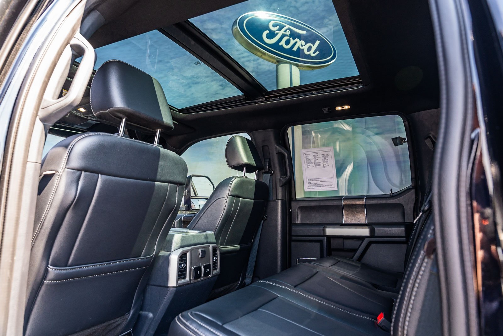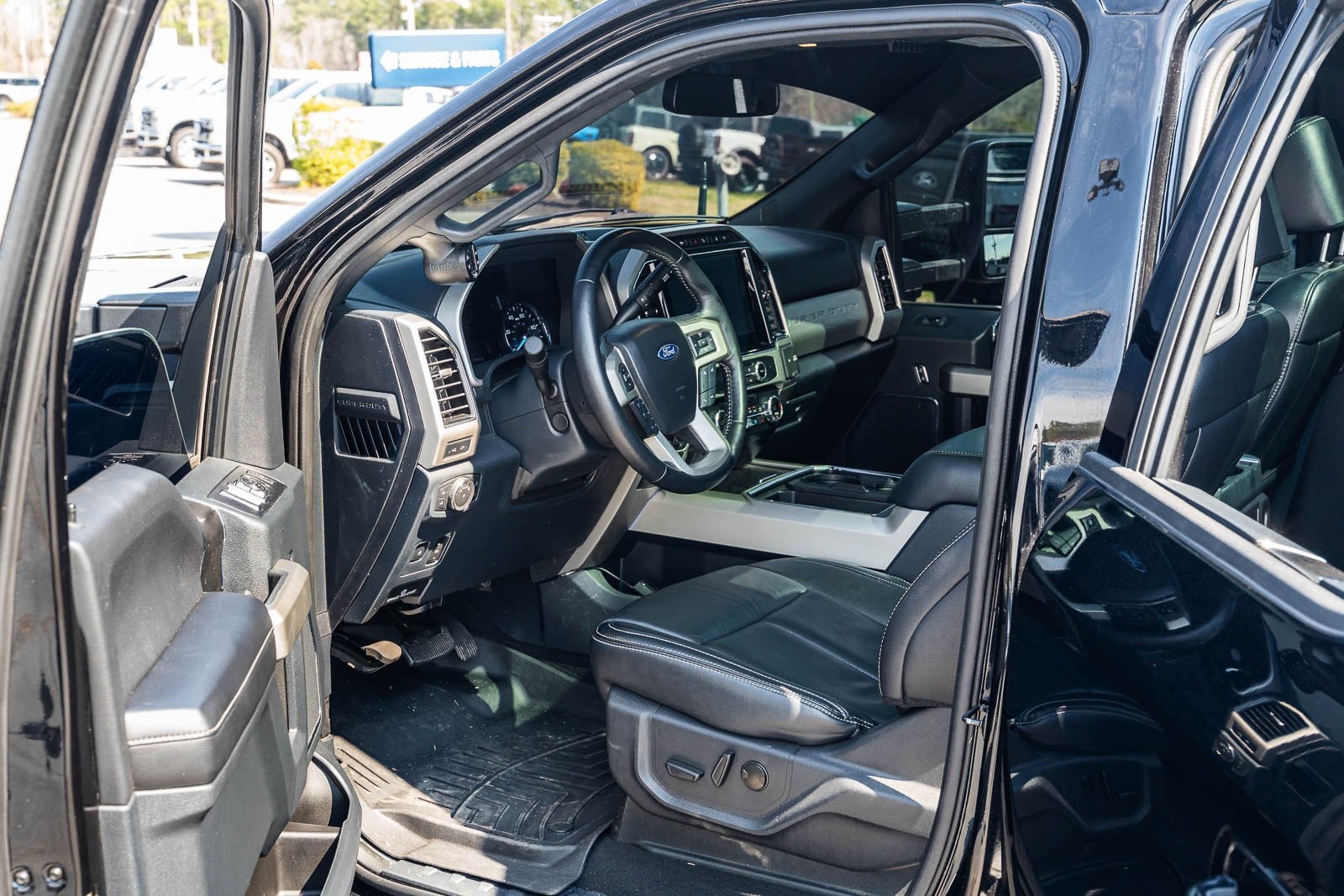 This vehicle comes equipped with GVWR: 10,000 lb Payload Package, High Capacity Trailer Tow Package, Lariat Black Appearance Pkg w/o Spray-In Bedliner (6" Ebony Black Angular Running Boards, Black Out Surrounds LED Only Headlamps, Body-Color Front & Rear Bumpers, Ebony Black Painted Front Grille Bars, Ebony Black Painted Mirror Caps, Rear Wheel Well Liners (Pre-Installed), and Wheels: 20" High-Gloss Black Premium Painted Alum), Lariat Ultimate Package (Ambient Lighting - Fixed Color, Easy Entry®/Exit Memory Driver's Seat Feature, Intelligent Access w/Push-Button Start, LED Box Lighting, Memory Power-Adjustable Pedals, Power Heated/Ventilated Driver Seat w/Memory, Power Heated/Ventilated Passenger Seat, Power Telescoping/Tilt Steering Wheel/Column, PowerScope Trailer Tow Mirrors w/Memory, Remote Start System, Remote Tailgate Release, and Tailgate Step & Handle), Order Code 608A, Pro Trailer Backup Assist - High Capacity (Lane Departure Warning System and Ultimate Trailer Tow Camera System), 4WD, 10 Speakers, 397 Amp Alternator, 4-Wheel Disc Brakes, ABS brakes, Adjustable pedals, Advanced Security Pack Inclination Sensor Removal, Air Conditioning, Alloy wheels, AM/FM radio: SiriusXM with 360L, Auto High-beam Headlights, Auto-dimming Rear-View mirror, Automatic temperature control, Brake assist, Bumpers: chrome, Compass, Delay-off headlights, Driver door bin, Driver vanity mirror, Dual front impact airbags, Dual front side impact airbags, Electronic Stability Control, Emergency communication system: SYNC 4 911 Assist, Engine Block Heater, Exterior Parking Camera Rear, Flow-Through Console, Front anti-roll bar, Front Bucket Seats, Front Center Armrest, Front dual zone A/C, Front fog lights, Front Leather Seating Surfaces 40/Console/40, Front reading lights, Fully automatic headlights, Heated door mirrors, Heated Steering Wheel, Illuminated entry, Leather steering wheel, LED Roof Clearance Lights, Low tire pressure warning, Navigation system: Connected Navigation, Outside temperature display, Overhead airbag, Overhead console, Panic alarm, Passenger door bin, Passenger vanity mirror, Power door mirrors, Power driver seat, Power passenger seat, Power steering, Power windows, Power-Deployable Running Boards, PowerScope Trailer Tow Mirrors w/Heat, Radio data system, Radio: B&O Sound System by Bang & Olufsen, Rain-Sensing Windshield Wipers, Rapid-Heat Supplemental Cab Heater, Rear Parking Sensors, Rear reading lights, Rear seat center armrest, Rear step bumper, Rear window defroster, Remote keyless entry, Security system, SiriusXM Radio w/360L, Speed control, Split folding rear seat, Steering wheel mounted audio controls, SYNC 4 w/Enhanced Voice Recognition, Tachometer, Telescoping steering wheel, Tilt steering wheel, Traction control, Trip computer, Turn signal indicator mirrors, Twin Panel Power Moonroof, Upfitter Switches (6), Variably intermittent wipers, and Wheels: 18" Bright Machined Cast Aluminum.