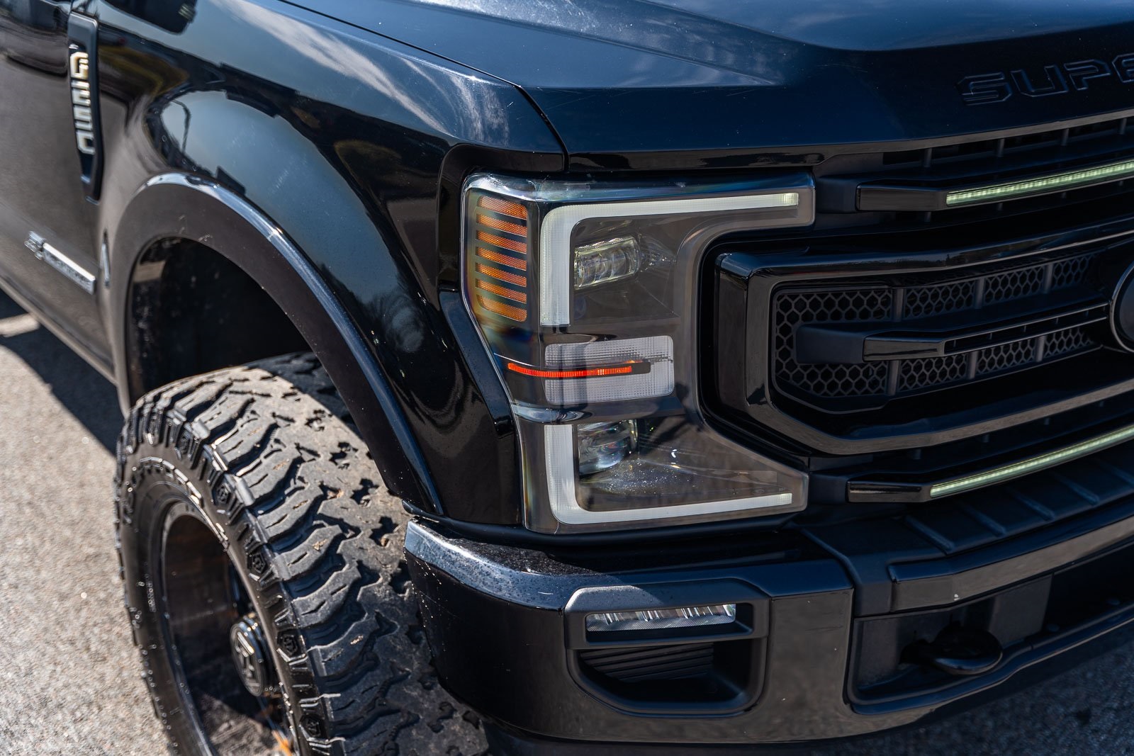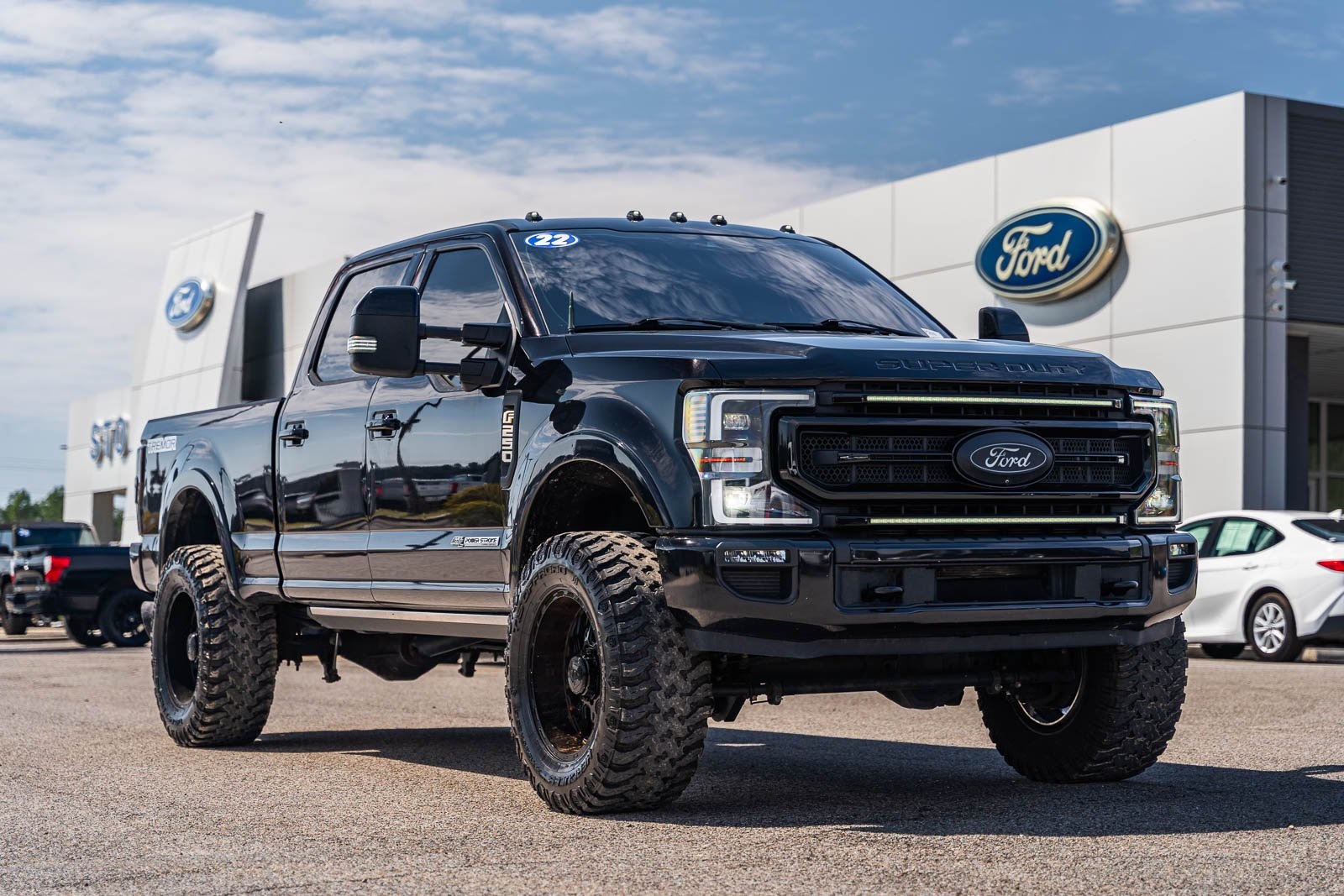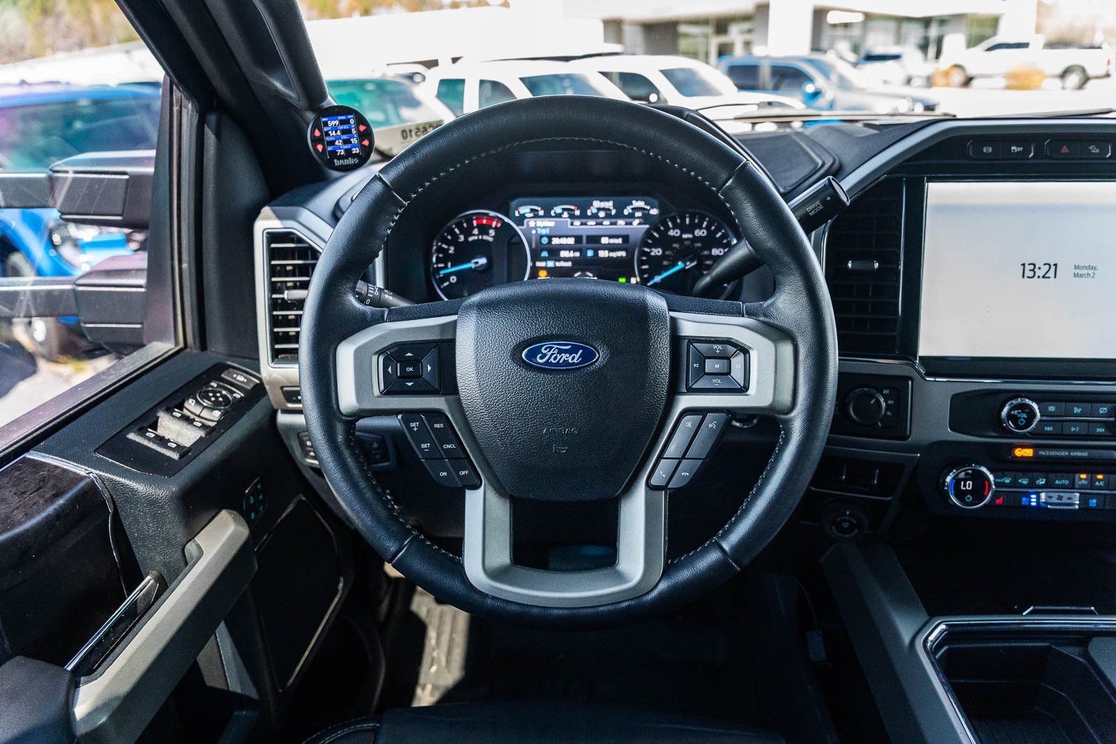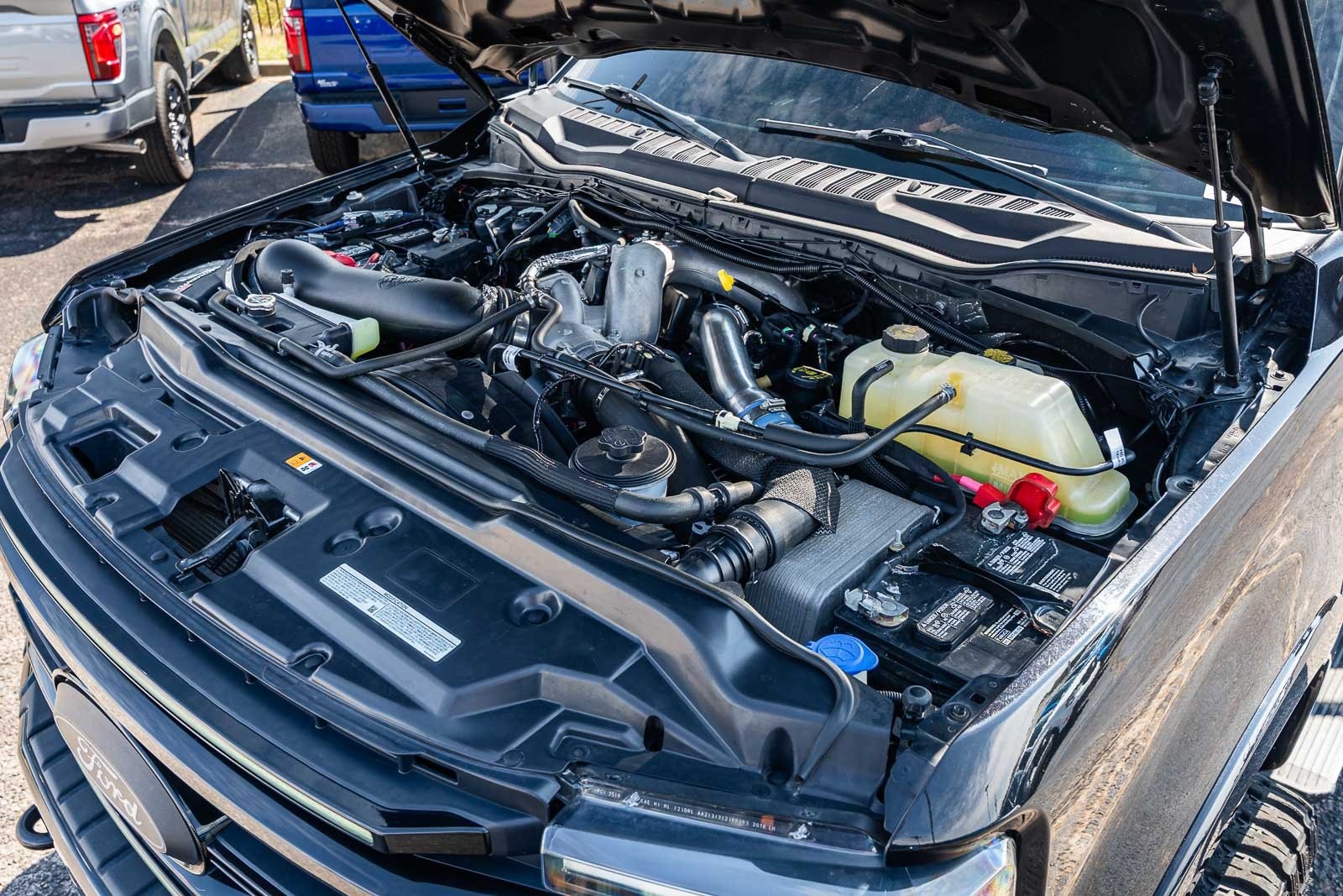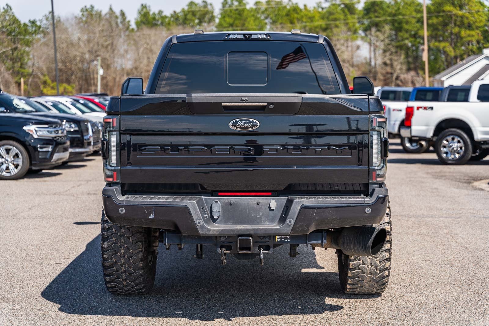This vehicle comes equipped with GVWR: 10,000 lb Payload Package, High Capacity Trailer Tow Package, Lariat Black Appearance Pkg w/o Spray-In Bedliner (6" Ebony Black Angular Running Boards, Black Out Surrounds LED Only Headlamps, Body-Color Front & Rear Bumpers, Ebony Black Painted Front Grille Bars, Ebony Black Painted Mirror Caps, Rear Wheel Well Liners (Pre-Installed), and Wheels: 20" High-Gloss Black Premium Painted Alum), Lariat Ultimate Package (Ambient Lighting - Fixed Color, Easy Entry®/Exit Memory Driver's Seat Feature, Intelligent Access w/Push-Button Start, LED Box Lighting, Memory Power-Adjustable Pedals, Power Heated/Ventilated Driver Seat w/Memory, Power Heated/Ventilated Passenger Seat, Power Telescoping/Tilt Steering Wheel/Column, PowerScope Trailer Tow Mirrors w/Memory, Remote Start System, Remote Tailgate Release, and Tailgate Step & Handle), Order Code 608A, Pro Trailer Backup Assist - High Capacity (Lane Departure Warning System and Ultimate Trailer Tow Camera System), 4WD, 10 Speakers, 397 Amp Alternator, 4-Wheel Disc Brakes, ABS brakes, Adjustable pedals, Advanced Security Pack Inclination Sensor Removal, Air Conditioning, Alloy wheels, AM/FM radio: SiriusXM with 360L, Auto High-beam Headlights, Auto-dimming Rear-View mirror, Automatic temperature control, Brake assist, Bumpers: chrome, Compass, Delay-off headlights, Driver door bin, Driver vanity mirror, Dual front impact airbags, Dual front side impact airbags, Electronic Stability Control, Emergency communication system: SYNC 4 911 Assist, Engine Block Heater, Exterior Parking Camera Rear, Flow-Through Console, Front anti-roll bar, Front Bucket Seats, Front Center Armrest, Front dual zone A/C, Front fog lights, Front Leather Seating Surfaces 40/Console/40, Front reading lights, Fully automatic headlights, Heated door mirrors, Heated Steering Wheel, Illuminated entry, Leather steering wheel, LED Roof Clearance Lights, Low tire pressure warning, Navigation system: Connected Navigation, Outside temperature display, Overhead airbag, Overhead console, Panic alarm, Passenger door bin, Passenger vanity mirror, Power door mirrors, Power driver seat, Power passenger seat, Power steering, Power windows, Power-Deployable Running Boards, PowerScope Trailer Tow Mirrors w/Heat, Radio data system, Radio: B&O Sound System by Bang & Olufsen, Rain-Sensing Windshield Wipers, Rapid-Heat Supplemental Cab Heater, Rear Parking Sensors, Rear reading lights, Rear seat center armrest, Rear step bumper, Rear window defroster, Remote keyless entry, Security system, SiriusXM Radio w/360L, Speed control, Split folding rear seat, Steering wheel mounted audio controls, SYNC 4 w/Enhanced Voice Recognition, Tachometer, Telescoping steering wheel, Tilt steering wheel, Traction control, Trip computer, Turn signal indicator mirrors, Twin Panel Power Moonroof, Upfitter Switches (6), Variably intermittent wipers, and Wheels: 18" Bright Machined Cast Aluminum.