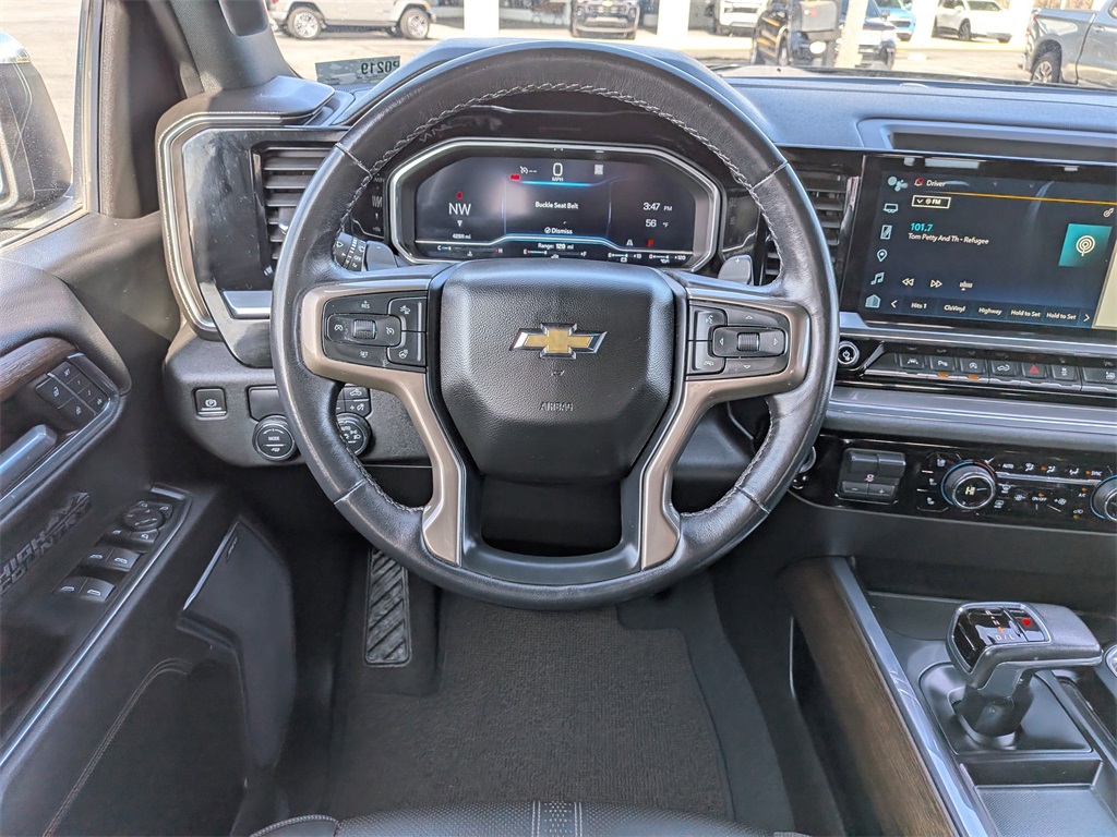 NAVIGATION SYSTEM, BACKUP CAMERA, AGGRESSIVE PRICING, ALLOY WHEELS, BLUETOOTH, CLIMATE PACKAGE, HEAT PACKAGE, LEATHER SEATS, MEMORY PACKAGE, POWER PACKAGE, REMOTE START, TOW PACKAGE, APPLE CAR PLAY, ANDROID AUTO, 10-Speed Automatic, Jet Black Leather, 10-Way Power Driver Seat w/Lumbar, 10-Way Power Passenger Seat Adjuster w/Lumbar, 12.3" Multicolor Reconfigurable Digital Display, 120-Volt Instrument Panel Power Outlet, 2 USB Data Ports, 2nd Row Heated Outboard Seats, Auto-Dimming Inside Rear-View Mirror, Auto-Locking Rear Differential, Bed View Camera, Bluetooth® For Phone, Body-Color Painted Mirror Caps, Chevytec Spray-On Black Bedliner, Chrome Assist Steps, Chrome Recovery Hooks, Color-Keyed Carpeting Floor Covering, Compass, Deep-Tinted Glass, Driver Memory, Dual Exhaust w/Polished Outlets, Dual Rear USB Ports (Charge Only), Electric Rear-Window Defogger, Electrical Steering Column Lock, Electronic Cruise Control, Floor Mounted Center Console, Front Carpeted Floor Mats, Front LED Fog Lamps, Front Rainsensing Wipers, HD Surround Vision, Heated Driver & Front Outboard Passenger Seats, Heated Steering Wheel, High Capacity Suspension Package, Hitch Guidance w/Hitch View, Integrated Trailer Brake Controller, Keyless Open & Start, LED Cargo Area Lighting, OnStar & Chevrolet Connected Services Capable, Outside Heated Power-Adjustable Mirrors, Perimeter Lighting, Power Front Passenger Windows w/Express Up/Down, Power Front Windows w/Driver Express Up/Down, Power Rear Windows w/Express Down, Power Sliding Rear Window w/Rear Defogger, Power Tailgate, Power Tilt & Telescoping Steering Column, Preferred Equipment Group 3LZ, Rear Carpeted Floor Mats, Rear Cross Traffic Alert-Braking, Rear Pedestrian Alert, Rear Wheelhouse Liners, Remote Vehicle Starter System, Safety Alert Seat, SiriusXM w/360L, Standard Tailgate, Steering Wheel Audio Controls, Theft Deterrent System (Unauthorized Entry), Trailer Camera Provisions, Trailer Side Blind Zone Alert, Trailering App, Trailering Package, Ultrasonic Front & Rear Park Assist, Universal Home Remote, Up-Level Rear Seat w/Storage Package, Ventilated Driver & Front Passenger Seats, Wireless Charging, Wireless Phone Projection, Wrapped Steering Wheel. Black 2023 Chevrolet Silverado 1500 High Country RWD 10-Speed Automatic EcoTec3 5.3L V8