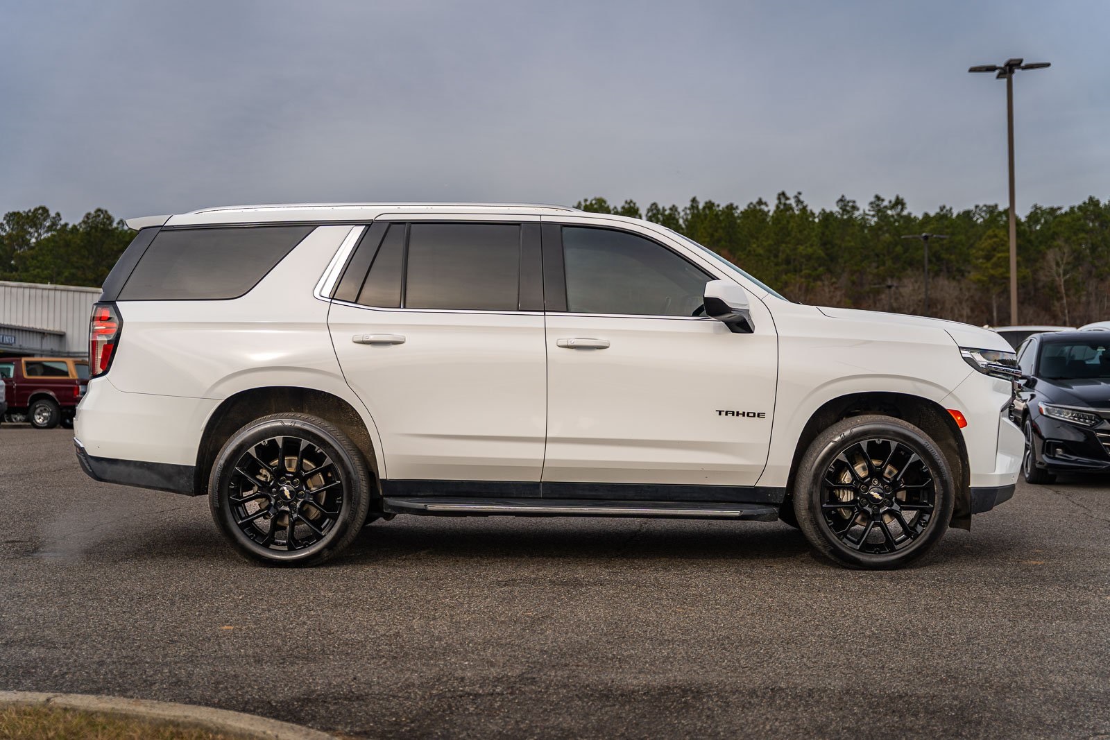 This vehicle comes equipped with License Plate Front Mounting Package, Preferred Equipment Group 1LS (1st & 2nd Row Color-Keyed Carpeted Floor Mats, Color-Keyed Carpeting Floor Covering, Driver & Front Outboard Passenger Airbags, Floor Console w/Storage Area, LED Daytime Running Lamps, Remote Start, SiriusXM Radio w/360L, and Wrapped Steering Wheel), Jet Black Cloth, 3.23 Rear Axle Ratio, 3rd row seats: split-bench, 4-Wheel Disc Brakes, 6 Speakers, 6-Speaker Audio System Feature, ABS brakes, Air Conditioning, Alloy wheels, AM/FM radio: SiriusXM with 360L, Apple CarPlay/Android Auto, Auto High-beam Headlights, Automatic temperature control, Black Name Plates (LPO), Brake assist, Bumpers: body-color, Compass, Delay-off headlights, Driver door bin, Driver vanity mirror, Dual front impact airbags, Dual front side impact airbags, Electronic Stability Control, Emergency communication system: OnStar and Chevrolet connected services capable, Four wheel independent suspension, Front & Rear Black Bowtie Emblems (LPO), Front anti-roll bar, Front Bucket Seats, Front Center Armrest, Front dual zone A/C, Front High-Back Reclining Bucket Seats, Front reading lights, Fully automatic headlights, Heated door mirrors, Illuminated entry, Infotainment Display, Low tire pressure warning, Occupant sensing airbag, Outside temperature display, Overhead airbag, Overhead console, Panic alarm, Passenger door bin, Passenger vanity mirror, Power door mirrors, Power driver seat, Power passenger seat, Power steering, Power windows, Premium Cloth Seat Trim, Premium Smooth Ride Suspension, Radio: Chevrolet Infotainment 3 System, Rain sensing wipers, Rear air conditioning, Rear anti-roll bar, Rear reading lights, Rear seat center armrest, Rear window defroster, Rear window wiper, Remote keyless entry, Roof rack: rails only, Security system, Speed control, Speed-sensing steering, Split folding rear seat, Spoiler, Steering wheel mounted audio controls, Tachometer, Telescoping steering wheel, Tilt steering wheel, Traction control, Trip computer, Variably intermittent wipers, Voltmeter, Wheels: 18" x 8.5" Bright Silver Painted Aluminum, Wheels: 22" Multi-Spoke Gloss Black (LPO) (SRV), and Wheels: 22" x 9" Steel Interim (LPO).