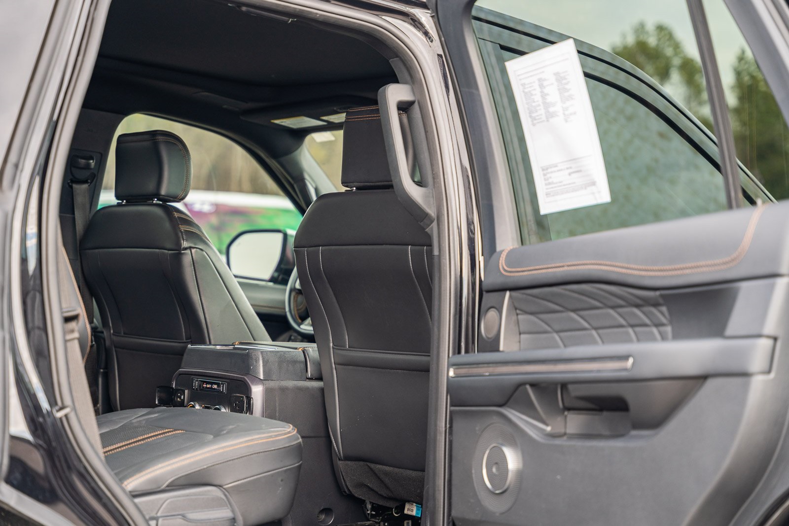 This vehicle comes equipped with Equipment Group 600A Standard Package, Heavy-Duty Trailer Tow Package (26mm Engine Radiator, 360-Degree Camera w/Trailer Reverse Guidance, Integrated Trailer Brake Controller, and Pro Trailer Backup Assist), Ford Gold Certified Certified, 22 Speakers, 3rd row seats: split-bench, 4-Wheel Disc Brakes, ABS brakes, Active Park Assist 2.0 Removal, Adaptive suspension, Adjustable pedals, Air Conditioning, Alloy wheels, AM/FM radio, Auto High-beam Headlights, Auto-dimming door mirrors, Auto-dimming Rear-View mirror, Automatic temperature control, Black Roof-Rail Crossbars, Brake assist, Bumpers: body-color, Compass, Delay-off headlights, Driver door bin, Driver vanity mirror, Dual front impact airbags, Dual front side impact airbags, Electronic Stability Control, Emergency communication system: SYNC 4 911 Assist, Exterior Parking Camera Rear, Four wheel independent suspension, Front anti-roll bar, Front Bucket Seats, Front Center Armrest, Front dual zone A/C, Front fog lights, Front reading lights, Fully automatic headlights, Garage door transmitter, Genuine wood console insert, Genuine wood dashboard insert, Genuine wood door panel insert, Hands-Free Foot-Activated Liftgate Removal (DISC), Heated door mirrors, Heated front seats, Heated rear seats, Heated steering wheel, Htd/Ventilated Prem Lthr Front Captain's Chairs (DISC), Illuminated entry, Leather steering wheel, Low tire pressure warning, Memory seat, Navigation System, Occupant sensing airbag, Outside temperature display, Overhead airbag, Overhead console, Panic alarm, Passenger door bin, Passenger vanity mirror, Pedal memory, Power door mirrors, Power driver seat, Power Liftgate, Power moonroof, Power passenger seat, Power steering, Power windows, Radio data system, Radio: B&O Unleashed Sound System by Bang & Olufsen, Rain sensing wipers, Rear air conditioning, Rear anti-roll bar, Rear audio controls, Rear reading lights, Rear window defroster, Rear window wiper, Reclining 3rd row seat, Remote keyless entry, Second Row Power Windows Removal, Security system, SiriusXM w/360L, Speed control, Speed-sensing steering, Speed-Sensitive Wipers, Split folding rear seat, Spoiler, Steering wheel memory, Steering wheel mounted audio controls, SYNC 4 w/Enhanced Voice Recognition, Tachometer, Telescoping steering wheel, Tilt steering wheel, Traction control, Trip computer, Turn signal indicator mirrors, Variably intermittent wipers, Ventilated front seats, Voltmeter, Wheels: 22" 12-Spoke Polished Aluminum, and Wheels: 22" 6-Spoke Polished Aluminum.
