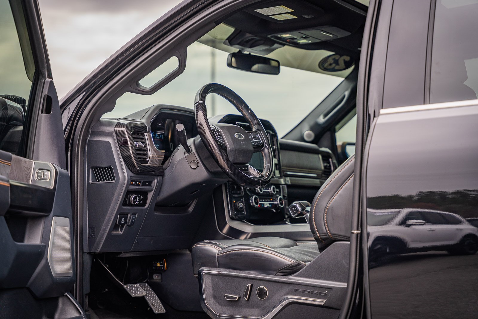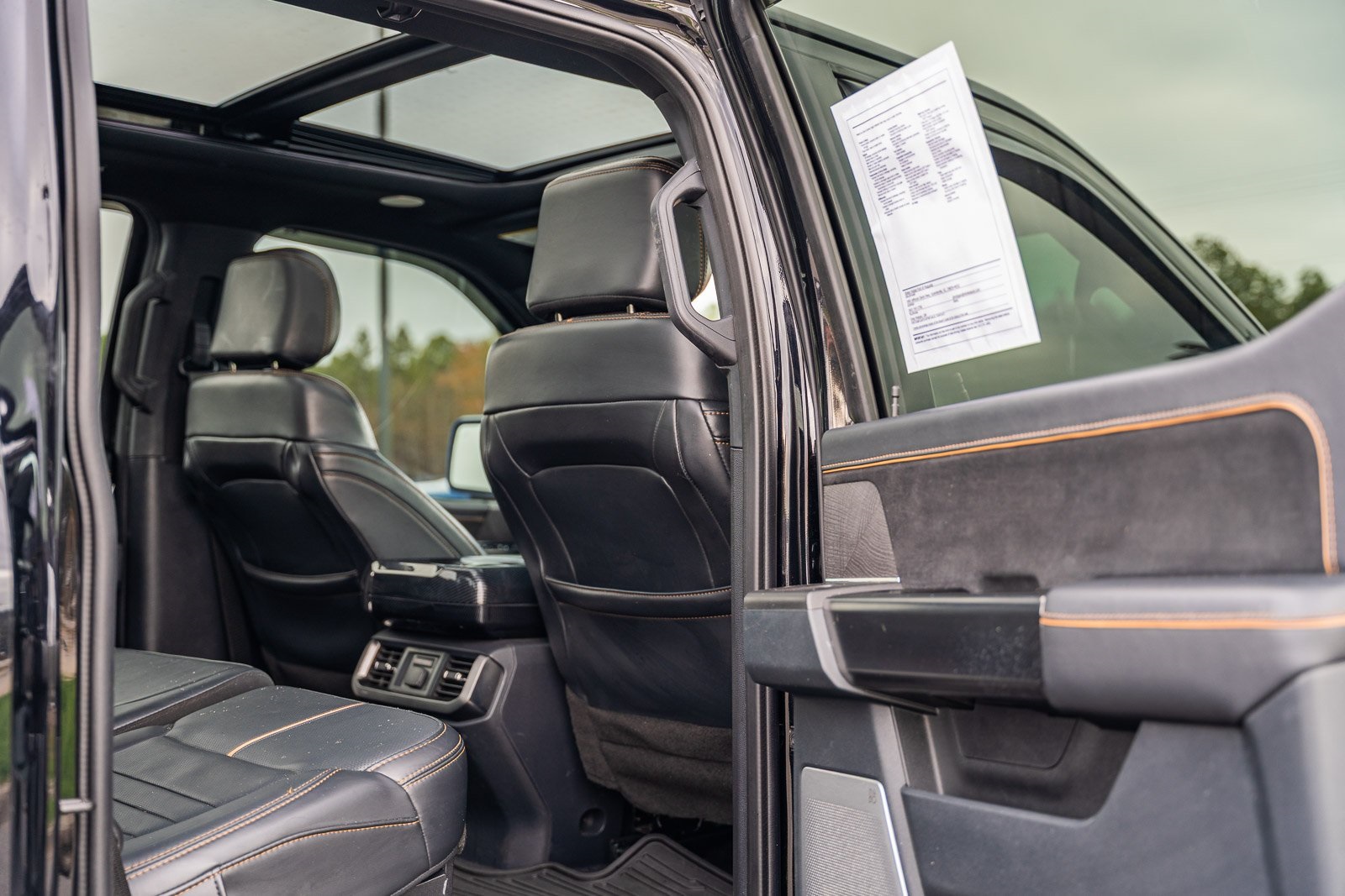 This vehicle comes equipped with Bed Utility Package (BoxLink, LED Box Lighting, Power Tailgate, and Tailgate Step w/Tailgate Work Surface), Equipment Group 701A High (360 Degree Camera, Pro Trailer Backup Assist & Pro Trailer Hitch Assist, and Radio: B&O Unleashed Sound System by Bang & Olufsen), Ford BlueCruise 1.0 (Active Park Assist 2.0), FX4 Off-Road Package (4x4 FX4 Off-Road Bodyside Decal, Hill Descent Control, Monotube Rear Shocks, Off-Road Tuned Front Shock Absorbers, Rock Crawl Mode, and Tray Style Floor Liner), Max Trailer Tow Package (Class IV Trailer Hitch Receiver, Extended Range 36 Gallon Fuel Tank, and Integrated Trailer Brake Controller), Ford Blue Certified Eligible Certified, 4WD, 20" Polished Aluminum Wheels, 4-Wheel Disc Brakes, 8 Speakers, ABS brakes, Active Park Assist 2.0 Removal, Adjustable pedals, Air Conditioning, Alloy wheels, AM/FM radio: SiriusXM with 360L, Auto High-beam Headlights, Auto tilt-away steering wheel, Auto-dimming door mirrors, Auto-dimming Rear-View mirror, Automatic temperature control, Brake assist, Bumpers: body-color, Center High-Mounted Stop Lamp CHMSL Camera Removal, Compass, Delay-off headlights, Driver door bin, Driver vanity mirror, Dual front impact airbags, Dual front side impact airbags, Electronic Stability Control, Emergency communication system: SYNC 4 911 Assist, Exterior Parking Camera Rear, Front anti-roll bar, Front Bucket Seats, Front Center Armrest, Front dual zone A/C, Front fog lights, Front reading lights, Front wheel independent suspension, Fully automatic headlights, Garage door transmitter, Heated door mirrors, Heated front seats, Heated rear seats, Heated steering wheel, Illuminated entry, Inclination/Intrusion Sensor Removal, Interior Work Surface, LED Sideview Mirror Spotlights, Low tire pressure warning, Memory seat, Multicontour Seats w/Active Motion Removal, Occupant sensing airbag, Outside temperature display, Overhead airbag, Overhead console, Panic alarm, Passenger door bin, Passenger vanity mirror, Pedal memory, Power door mirrors, Power driver seat, Power passenger seat, Power steering, Power windows, Radio data system, Radio: B&O Sound System by Bang & Olufsen, Rain sensing wipers, Rear reading lights, Rear seat center armrest, Rear step bumper, Rear window defroster, Remote keyless entry, Security system, Speed control, Speed-sensing steering, Split folding rear seat, Steering Wheel Heat Removal (DISC), Steering wheel memory, Steering wheel mounted audio controls, SYNC 4 w/Enhanced Voice Recognition, Tachometer, Telescoping steering wheel, Tilt steering wheel, Traction control, Trip computer, Turn signal indicator mirrors, Twin Panel Moonroof, Unique Multi-Contour Leather Bucket Seats, Variably intermittent wipers, Ventilated front seats, and Voltmeter.