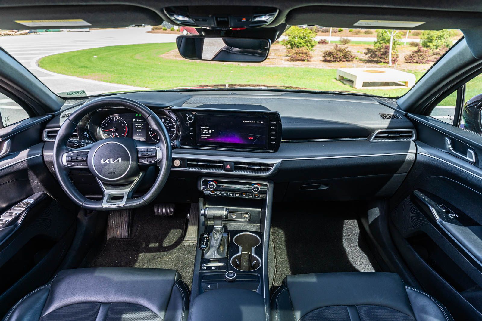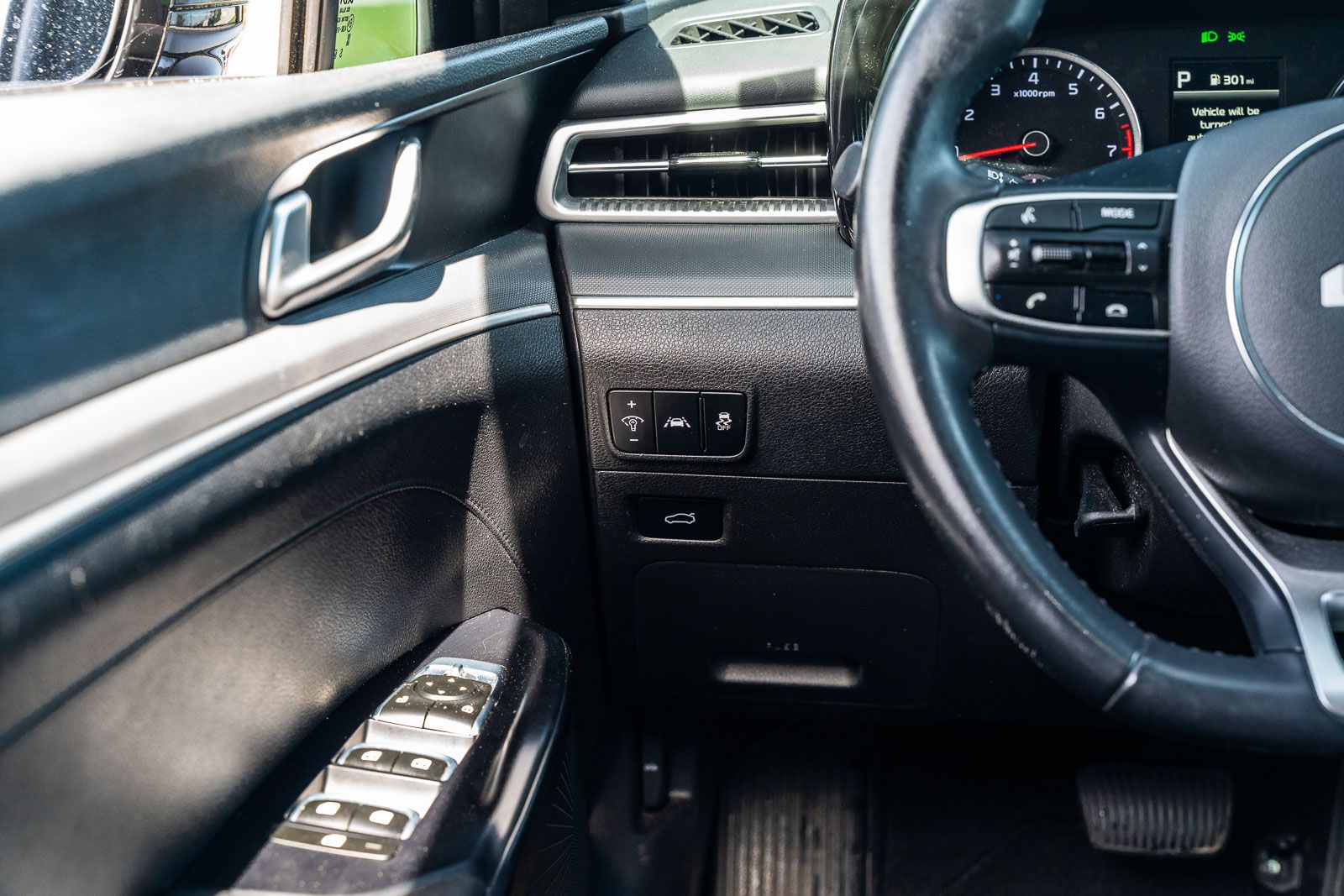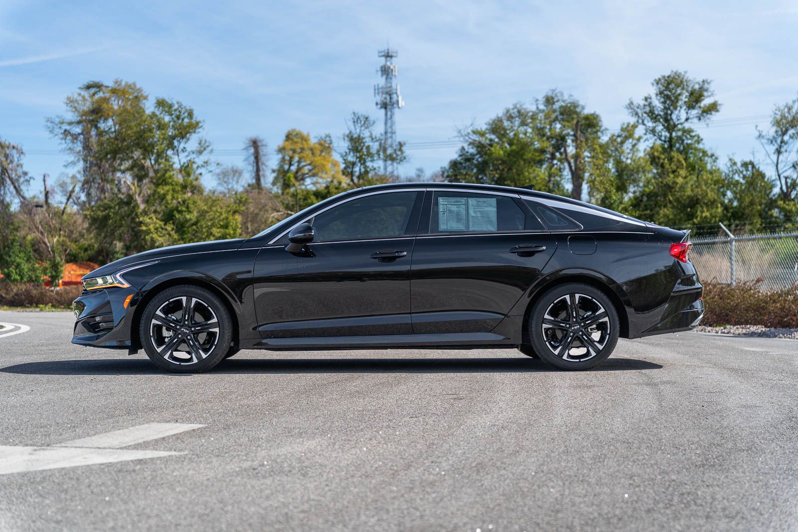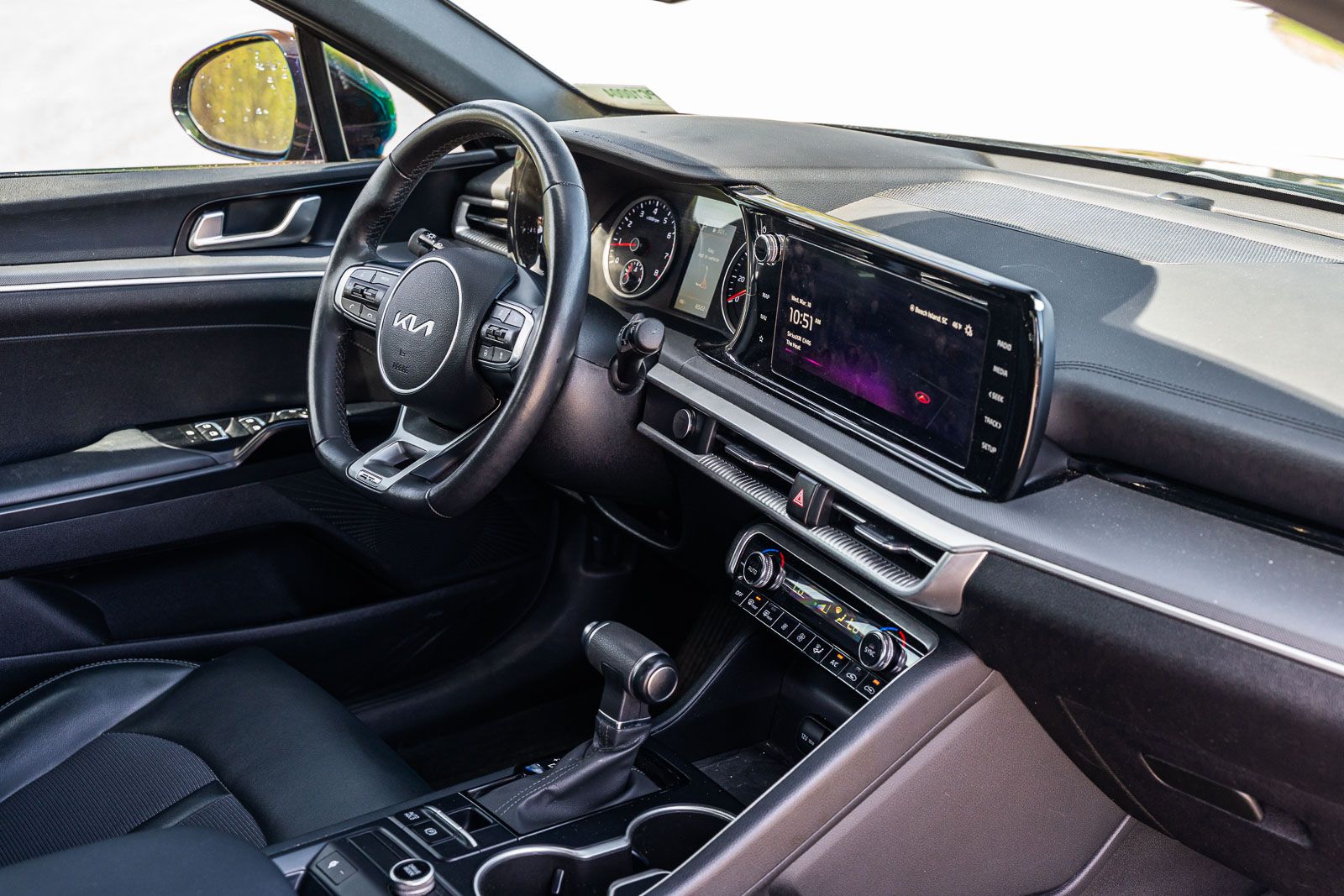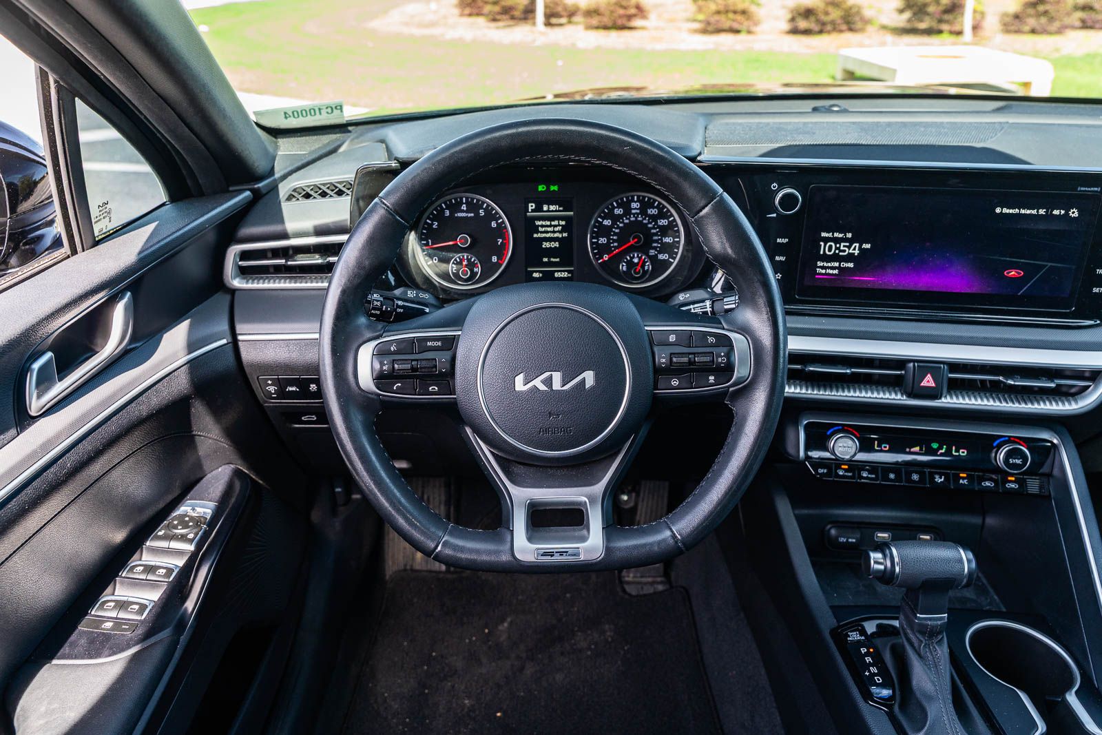 This K5 GT-Line includes GT-Line Panoramic Sunroof Package (LED Interior Lighting and Panoramic Sunroof), GT-Line Premium Package (Forward Collision Avoidance-Assist, Highway Driving Assist, LED Projection Headlamps, and Smart Cruise Control w/Stop & Go), 4-Wheel Disc Brakes, 6 Speakers, ABS brakes, Air Conditioning, Alloy wheels, AM/FM radio: SiriusXM, Apple CarPlay & Android Auto, Auto High-beam Headlights, Automatic temperature control, Brake assist, Bumpers: body-color, Carpeted Floor Mats, Cloth/SynTex Seat Trim, Delay-off headlights, Driver door bin, Driver vanity mirror, Dual front impact airbags, Dual front side impact airbags, EC Mirror w/Homelink, Electronic Stability Control, Four wheel independent suspension, Front anti-roll bar, Front Bucket Seats, Front Center Armrest, Front dual zone A/C, Front fog lights, Front reading lights, Fully automatic headlights, Heated door mirrors, Illuminated entry, Knee airbag, Low tire pressure warning, Navigation System, Occupant sensing airbag, Outside temperature display, Overhead airbag, Overhead console, Panic alarm, Passenger door bin, Passenger vanity mirror, Power door mirrors, Power driver seat, Power steering, Power windows, Puddle Lamps, Radio data system, Radio: AM/FM/MP3 Audio System, Rear anti-roll bar, Rear seat center armrest, Rear side impact airbag, Rear window defroster, Remote keyless entry, Security system, Speed control, Speed-sensing steering, Split folding rear seat, Spoiler, Sport steering wheel, Steering wheel mounted audio controls, Tachometer, Telescoping steering wheel, Tilt steering wheel, Traction control, Trip computer, Turn signal indicator mirrors, Variably intermittent wipers, and Wheels: 18" Gloss Black Machined Finish Alloy . While every effort has been made to ensure display of accurate data, the vehicle listings within this web site may not reflect all accurate vehicle items. All Inventory listed is subject to prior sale. The vehicle photo displayed may be an example only. Pricing throughout the web site does not include any options that may have been installed at the dealership. Please see the dealer for details. Vehicles may be in transit or currently in production. Some vehicles are shown with optional equipment. See the actual vehicle for complete accuracy of features, options & pricing. Because of the numerous possible combinations of vehicle models, styles, colors and options, the vehicle pictures on this site may not match your vehicle exactly; however, it will match as closely as possible. Some vehicle images shown are stock photos and may not reflect your exact choice of vehicle, color, trim and specification. Not responsible for pricing or typographical errors. Virtual Inventory, Available Configurations and In-Transit inventory contains vehicles that have not actually been manufactured. These vehicles show consumers sample vehicles that may be available. Pricing, Options, Color, and other data pertaining to these vehicles are provided for example only. All information pertaining to these vehicles should be independently verified through the dealer. 27/37 City/Highway MPG