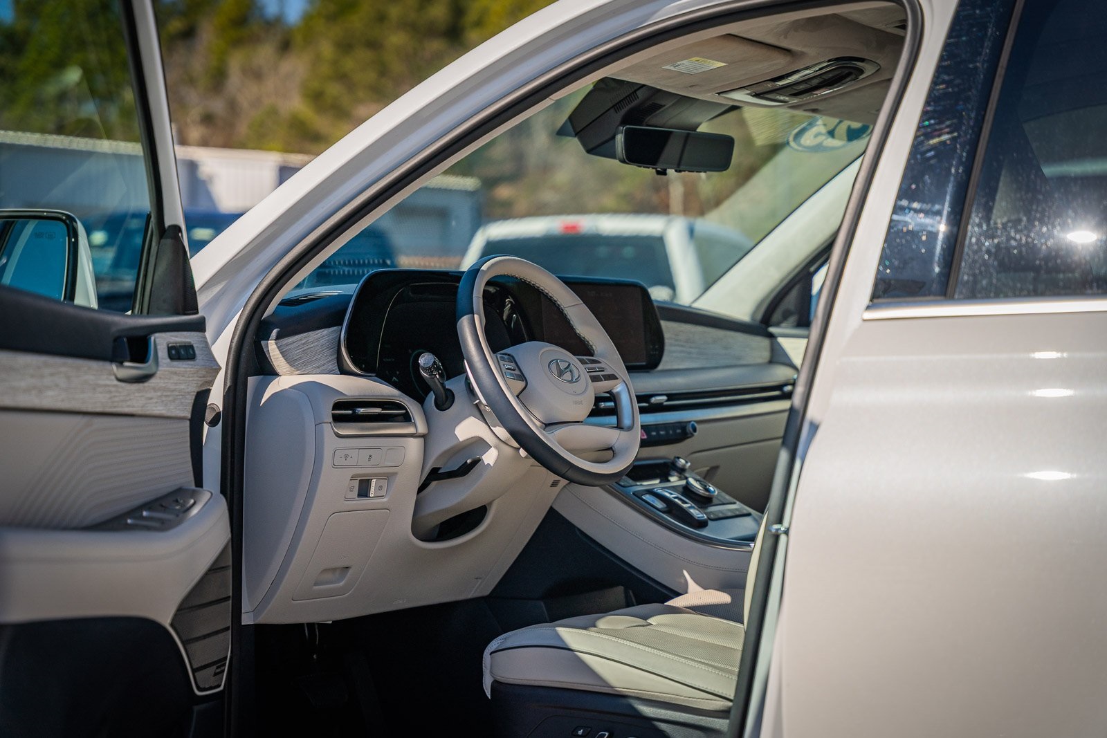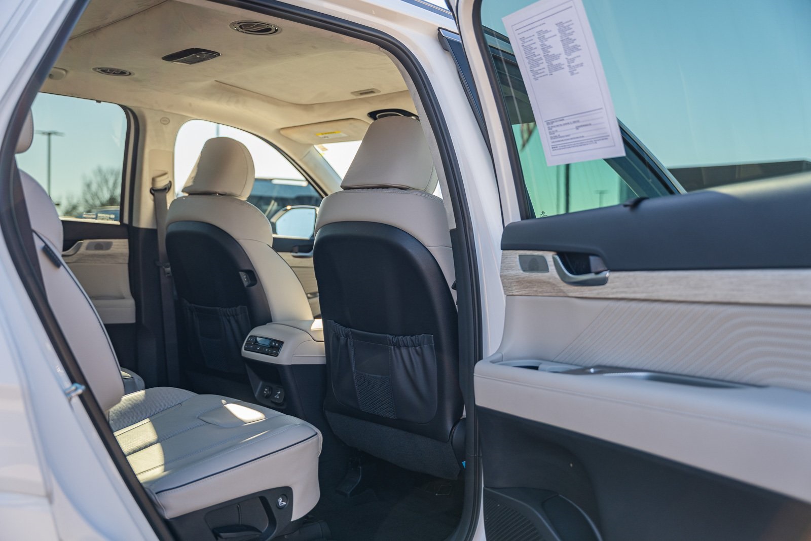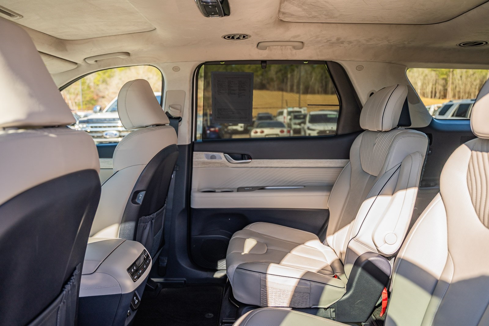 This vehicle comes equipped with Option Group 01, Hyundai Certified, 12 Speakers, 3rd row seats: split-bench, 4-Wheel Disc Brakes, ABS brakes, Air Conditioning, Alloy wheels, AM/FM radio: SiriusXM, Apple CarPlay & Android Auto, Auto High-beam Headlights, Auto-dimming door mirrors, Auto-dimming Rear-View mirror, Auto-leveling suspension, Automatic temperature control, Brake assist, Bumpers: body-color, Cargo Net, Carpeted Floor Mats, Compass, Delay-off headlights, Driver door bin, Driver vanity mirror, Dual front impact airbags, Dual front side impact airbags, Electronic Stability Control, Emergency communication system, Exterior Parking Camera Rear, First Aid Kit, Four wheel independent suspension, Front anti-roll bar, Front Bucket Seats, Front Center Armrest, Front dual zone A/C, Front reading lights, Fully automatic headlights, Garage door transmitter: HomeLink, harman/kardon® Speakers, Heads-Up Display, Heated & Ventilated Front Bucket Seats, Heated door mirrors, Heated front seats, Heated rear seats, Heated steering wheel, Illuminated Door Sill Plates, Illuminated entry, Knee airbag, Leather steering wheel, Low tire pressure warning, Memory seat, Navigation System, Occupant sensing airbag, Outside temperature display, Overhead airbag, Overhead console, Panic alarm, Passenger door bin, Passenger vanity mirror, Power door mirrors, Power driver seat, Power Liftgate, Power moonroof, Power passenger seat, Power steering, Power windows, Premium Nappa Leather Seat Trim, Radio data system, Radio: AM/FM/MP3 Premium Audio System, Rain sensing wipers, Rear air conditioning, Rear anti-roll bar, Rear audio controls, Rear reading lights, Rear side impact airbag, Rear window defroster, Rear window wiper, Reclining 3rd row seat, Remote keyless entry, Security system, Speed control, Speed-sensing steering, Split folding rear seat, Spoiler, Steering wheel mounted audio controls, Tachometer, Telescoping steering wheel, Tilt steering wheel, Traction control, Trip computer, Turn signal indicator mirrors, Variably intermittent wipers, Ventilated front seats, Ventilated rear seats, and Wheels: 20" x 7.5J Calligraphy Exclusive Alloy.
