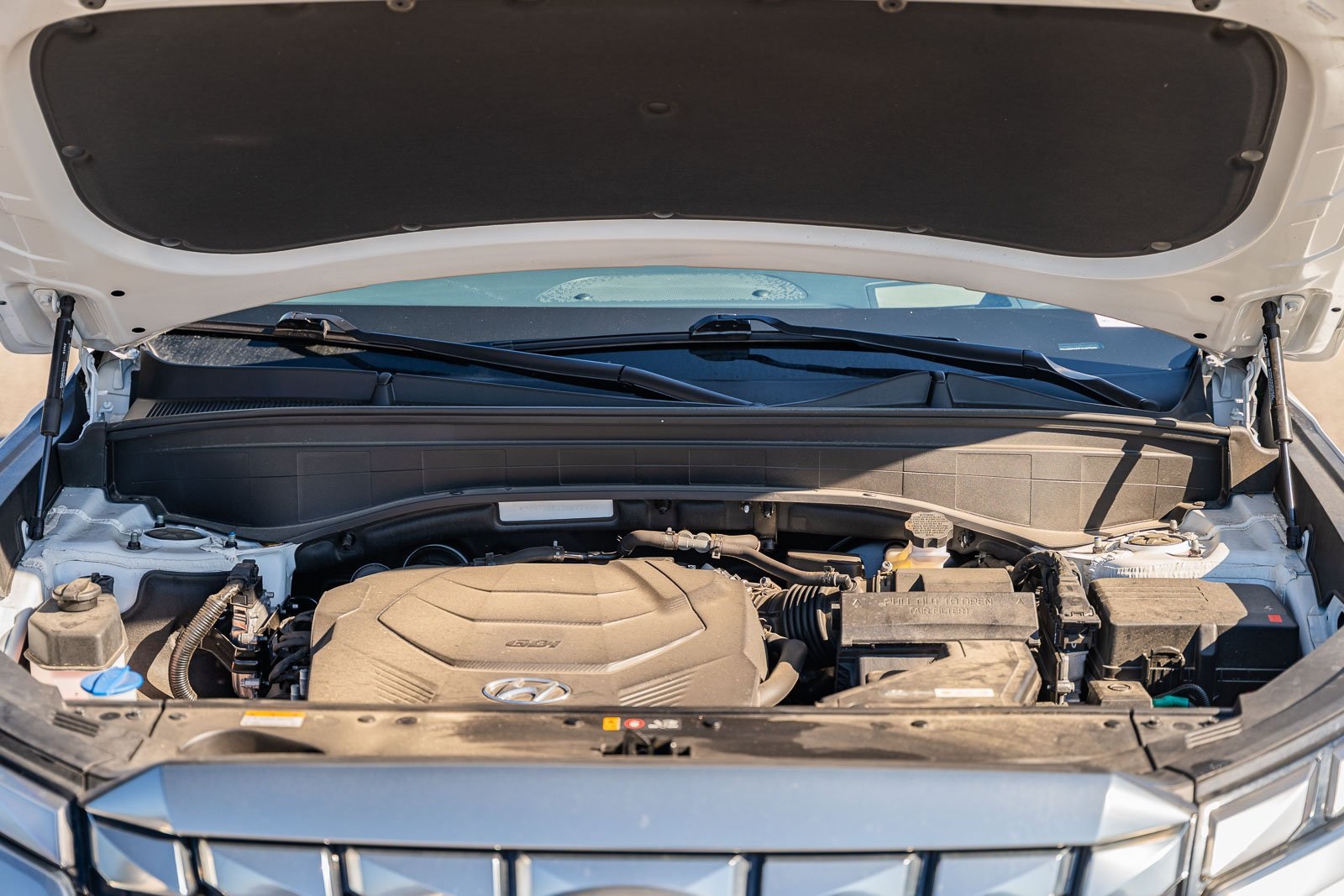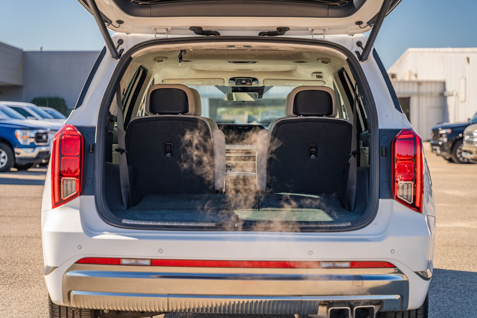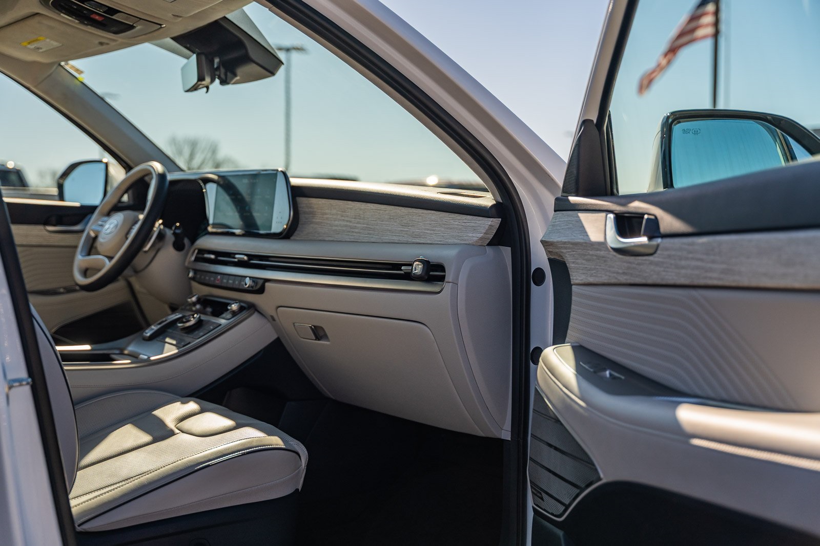 This vehicle comes equipped with Option Group 01, Hyundai Certified, 12 Speakers, 3rd row seats: split-bench, 4-Wheel Disc Brakes, ABS brakes, Air Conditioning, Alloy wheels, AM/FM radio: SiriusXM, Apple CarPlay & Android Auto, Auto High-beam Headlights, Auto-dimming door mirrors, Auto-dimming Rear-View mirror, Auto-leveling suspension, Automatic temperature control, Brake assist, Bumpers: body-color, Cargo Net, Carpeted Floor Mats, Compass, Delay-off headlights, Driver door bin, Driver vanity mirror, Dual front impact airbags, Dual front side impact airbags, Electronic Stability Control, Emergency communication system, Exterior Parking Camera Rear, First Aid Kit, Four wheel independent suspension, Front anti-roll bar, Front Bucket Seats, Front Center Armrest, Front dual zone A/C, Front reading lights, Fully automatic headlights, Garage door transmitter: HomeLink, harman/kardon® Speakers, Heads-Up Display, Heated & Ventilated Front Bucket Seats, Heated door mirrors, Heated front seats, Heated rear seats, Heated steering wheel, Illuminated Door Sill Plates, Illuminated entry, Knee airbag, Leather steering wheel, Low tire pressure warning, Memory seat, Navigation System, Occupant sensing airbag, Outside temperature display, Overhead airbag, Overhead console, Panic alarm, Passenger door bin, Passenger vanity mirror, Power door mirrors, Power driver seat, Power Liftgate, Power moonroof, Power passenger seat, Power steering, Power windows, Premium Nappa Leather Seat Trim, Radio data system, Radio: AM/FM/MP3 Premium Audio System, Rain sensing wipers, Rear air conditioning, Rear anti-roll bar, Rear audio controls, Rear reading lights, Rear side impact airbag, Rear window defroster, Rear window wiper, Reclining 3rd row seat, Remote keyless entry, Security system, Speed control, Speed-sensing steering, Split folding rear seat, Spoiler, Steering wheel mounted audio controls, Tachometer, Telescoping steering wheel, Tilt steering wheel, Traction control, Trip computer, Turn signal indicator mirrors, Variably intermittent wipers, Ventilated front seats, Ventilated rear seats, and Wheels: 20" x 7.5J Calligraphy Exclusive Alloy.