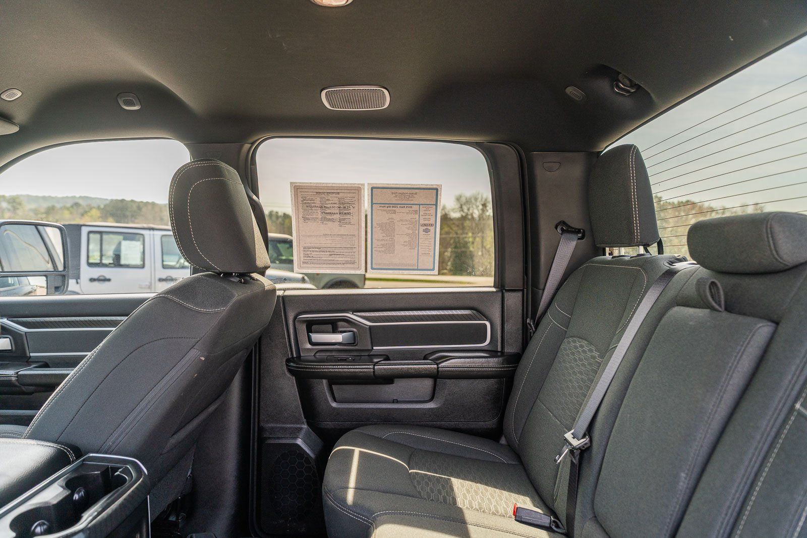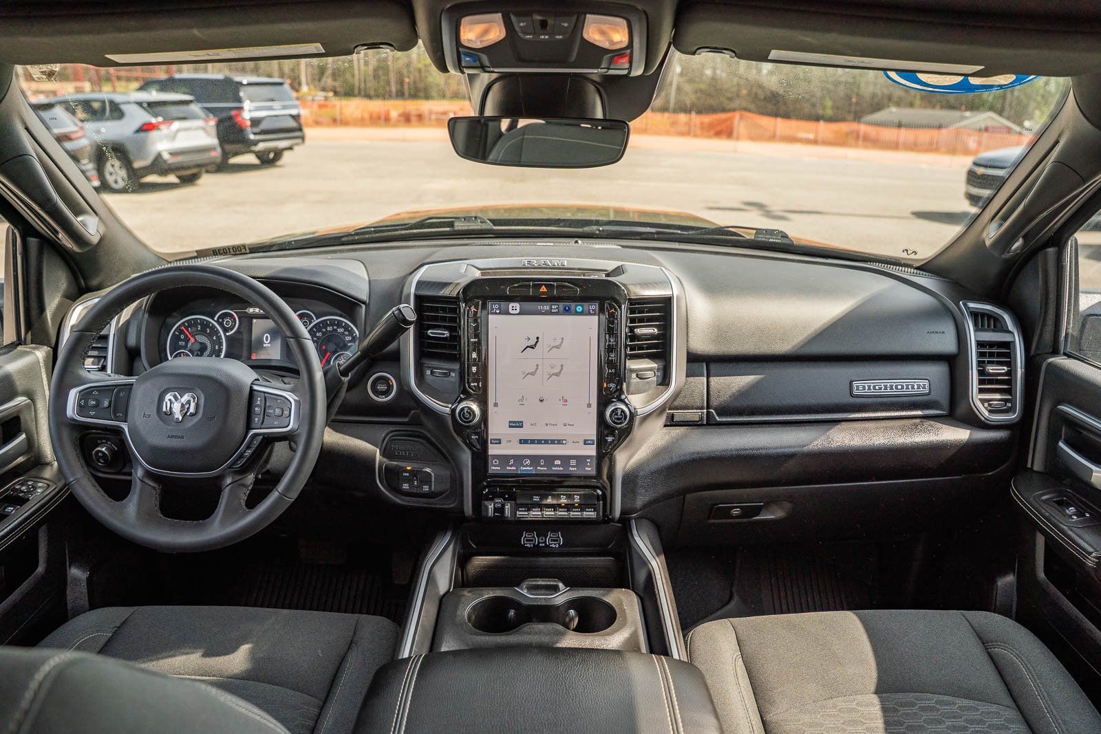 This vehicle comes equipped with Big Horn Level 1 Plus Equipment Group (12" Touchscreen Display, 2 Way Rear Headrest Seat, 2nd Row In Floor Storage Bins, 4 Way Front Headrests, 40/20/40 Split Bench Seat, 4G LTE Wi-Fi Hot Spot, 9 Alpine Speakers w/Subwoofer, Air Conditioning ATC w/Dual Zone Control, Alexa Built-In, Anti-Spin Differential Rear Axle, Apple CarPlay, Auto Power-Folding Mirrors, Auto-Dimming Rear-View Mirror, Black Exterior Mirrors, Connected Travel & Traffic Services, Connectivity - US/Canada, Dual Glove Boxes, Emergency Vehicle Alert System (EVAS), Exterior Mirrors Courtesy Lamps, Exterior Mirrors w/Heating Element, Exterior Mirrors w/Supplemental Signals, Foam Bottle Insert (Door Trim Panel), Folding Flat Load Floor Storage, Footwell Courtesy Lamp, Forward & Reverse Utility Lights, Front Armrest w/Cupholders, Front Center Seat Cushion Storage, Front Seat Back Map Pockets, Global Telematics Box Module (TBM), Glove Box Lamp, Google Android Auto, GPS Antenna Input, GPS Navigation, HD Radio, Integrated Voice Command w/Bluetooth, LED Bed Lighting, Locking Lower Glove Box, Luxury Steering Wheel, Manual Adjust 4-Way Front Passenger Seat, Mirror Running Lights, MOPAR Deployable Bed Step, MOPAR Spray In Bedliner, Off-Road Info Pages, Power 2-Way Driver Lumbar Adjust, Power Adjust 8-Way Driver Seat, Power Adjust Mirrors, Power Adjustable Convex Aux Mirrors, Power Heated Folding Telescopic Mirrors, Power Telescoping Mirrors, Premium Cloth 40/20/40 Bench Seat, Radio: Uconnect 5 Nav w/12.0" Display, Rear 60/40 Folding Seat, Rear Dome w/On/Off Switch Lamp, Remote Start System, Remote USB Port - Charge Only, Selectable Tire Fill Alert, SiriusXM Radio Service, SiriusXM w/360L, Steering Wheel Mounted Audio Controls, Storage Tray, and Trailer Tow Pages), Heated Seats & Wheel Group (Heated Front Seats and Heated Steering Wheel), Quick Order Package 2UZ Big Horn, 3.73 Axle Ratio, 4-Wheel Disc Brakes, 5th Wheel/Gooseneck Towing Prep Group, 6 Speakers, ABS brakes, Air Conditioning, Alloy wheels, AM/FM radio: SiriusXM, Apple CarPlay/Android Auto, Brake assist, Bumpers: chrome, Clearance Lamps, Cloth 40/20/40 Bench Seat, Compass, Dash Pass Thru Wire Circuits, Delay-off headlights, Driver door bin, Dual front impact airbags, Dual front side impact airbags, Electronic Stability Control, Front anti-roll bar, Front Center Armrest w/Storage, Front fog lights, Front License Plate Bracket, Front reading lights, Fully automatic headlights, Heated door mirrors, I/P Mounted Auxiliary Switches, Illuminated entry, Low tire pressure warning, Manual Adjust 4-Way Driver Seat, Manufacturer's Statement of Origin, MOPAR Front & Rear Rubber Floor Mats, Occupant sensing airbag, Outside temperature display, Overhead airbag, Overhead console, Panic alarm, ParkView Rear Back-Up Camera, Passenger door bin, Passenger vanity mirror, Power door mirrors, Power steering, Power windows, Radio data system, Radio: Uconnect 5 w/8.4" Display, Rear anti-roll bar, Rear Folding Seat, Rear seat center armrest, Rear step bumper, Rear Wheelhouse Liners, Rear window defroster, Remote keyless entry, Security system, Speed control, Tachometer, Tilt steering wheel, Traction control, Trip computer, Turn signal indicator mirrors, Variably intermittent wipers, Vinyl 2nd Row Seat, Voltmeter, and Wheels: 18" x 8.0" Polished Aluminum.
